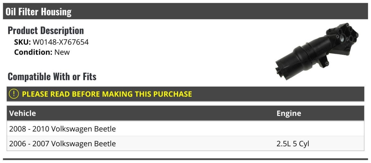 - Oil Filter Housing For 2006-2010 Volkswagen Beetle 2 5l 5-cylinder