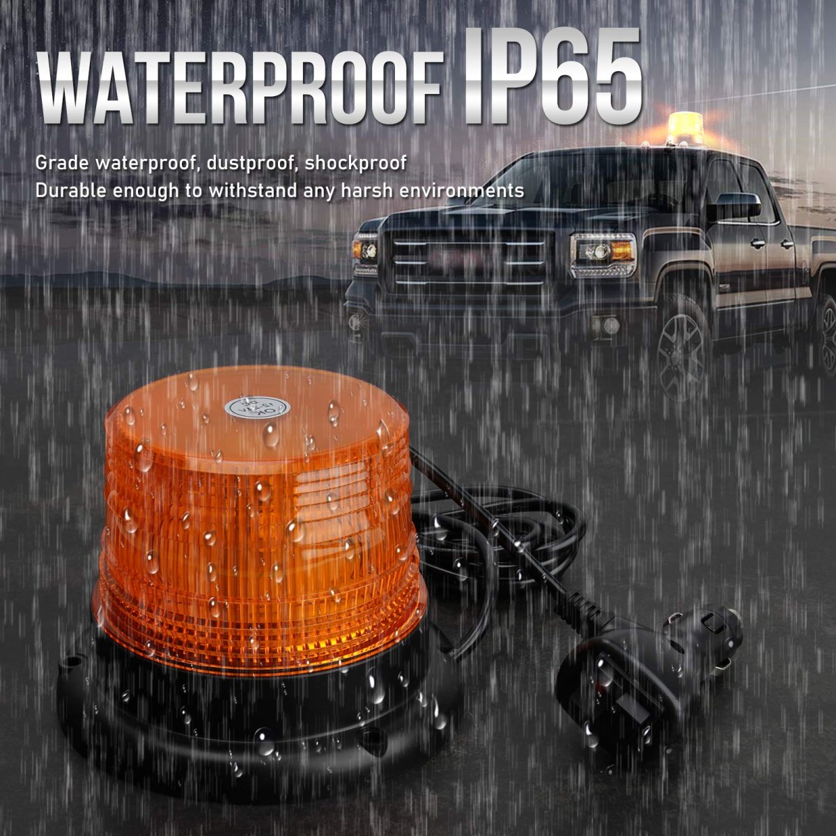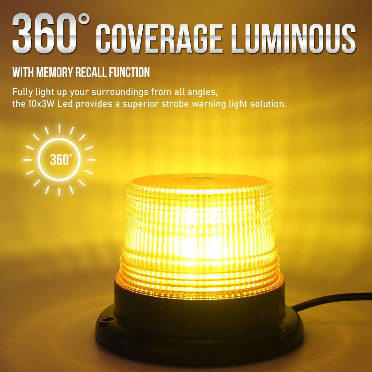 7 Flashing Mode Amber Strobe Beacon Light 7 different flash patterns with a independent switch to cycle through modes. Memorizes last pattern used (recall last pattern).. Super Bright Amber Beacon Light 10pcs 3W LEDs with with Durable PC Lens, 360 degrees of coverage. keep security in fog, rain or snow and other low visibility area. Upgraded Cigarette Lighter Plug Amber Strobe Beacon Lights Convenient and novel switch button, multi-flash mode switch button.. Easy Installation Amber Beacon Light comes with strong magnets (Test go up to 60mph but not fall off) and 12V-24V switch plug. Just need attach the strong magnets on any metal exterior of cars and plug the switch plug.. Amber Strobe Beacon Light Fitment Compatible with all those vehicles equipped with a 12-24V power socket. Great for emergency vehicles, postal service, construction vehicle, Truck Vehicle, Forklift, Tractor, Golf Carts, UTV Car, School Bus and safety warning etc..Other fine products