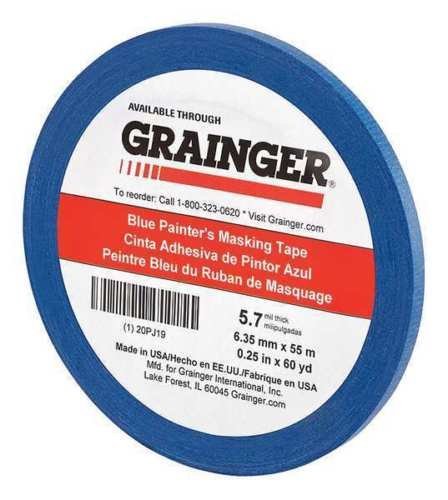 Painters Masking Tape, Material Crepe Paper, Blue, Shape Continuous Roll, Width 1/4 In. , Length 60 yd. , Thickness 5. 7 mil, Tensile Strength 26 lb. /in. , Adhesion Strength 32 oz. /in. , Rubber Adhesive, Performance Temp. 50 Degrees to 200 Degrees F, Standards ASTM D6123, D6123M-97 Type I Age: 3 years Features: Price For: Each Adhesive: Rubber Shape: Continuous Roll Length: 60 yd. Dia. : 3" Standards: ASTM D6123, D6123M-97 Type I Item: Painters Masking Tape Color: Blue Performance Temp. : 50 Degrees to 200 Degrees F Adhesion Strength: 32 oz. /in. Thickness: 5. 7 mil Tensile Strength: 26 lb. /in. Rolls/Case: 48 Width: 1/4" Type: Clean Release Painters Tape Material: Crepe Paper Country of Origin (subject to change): United States.