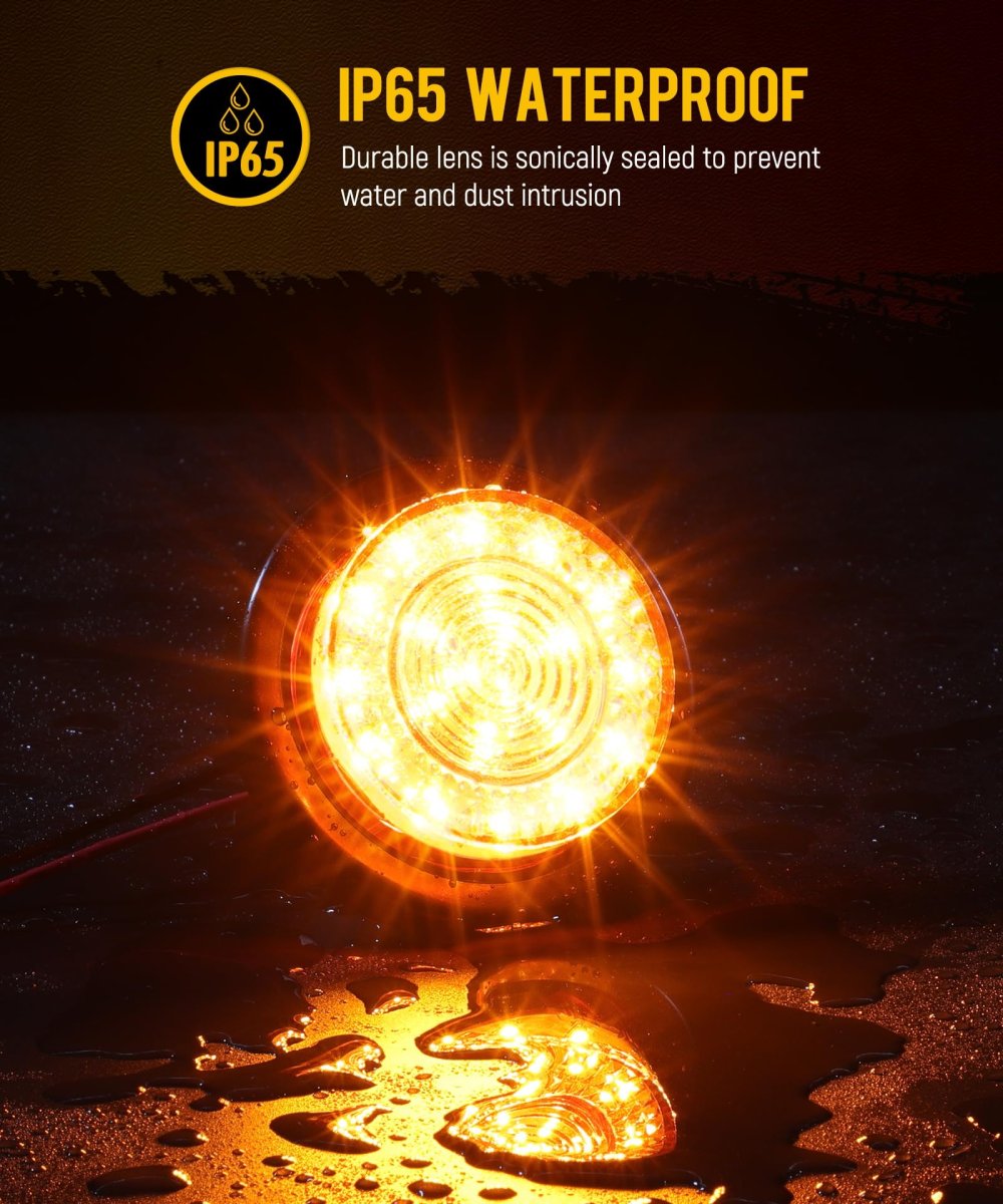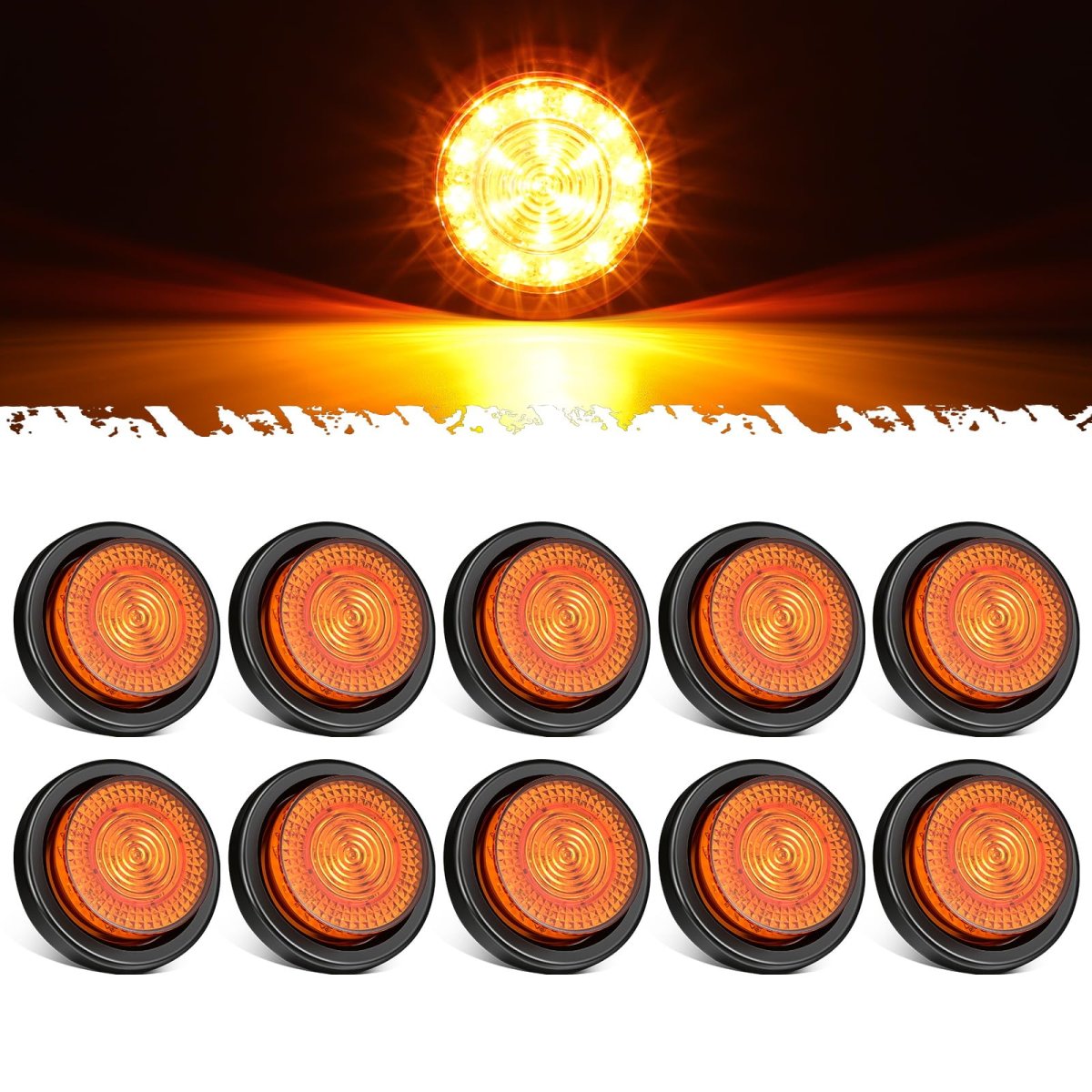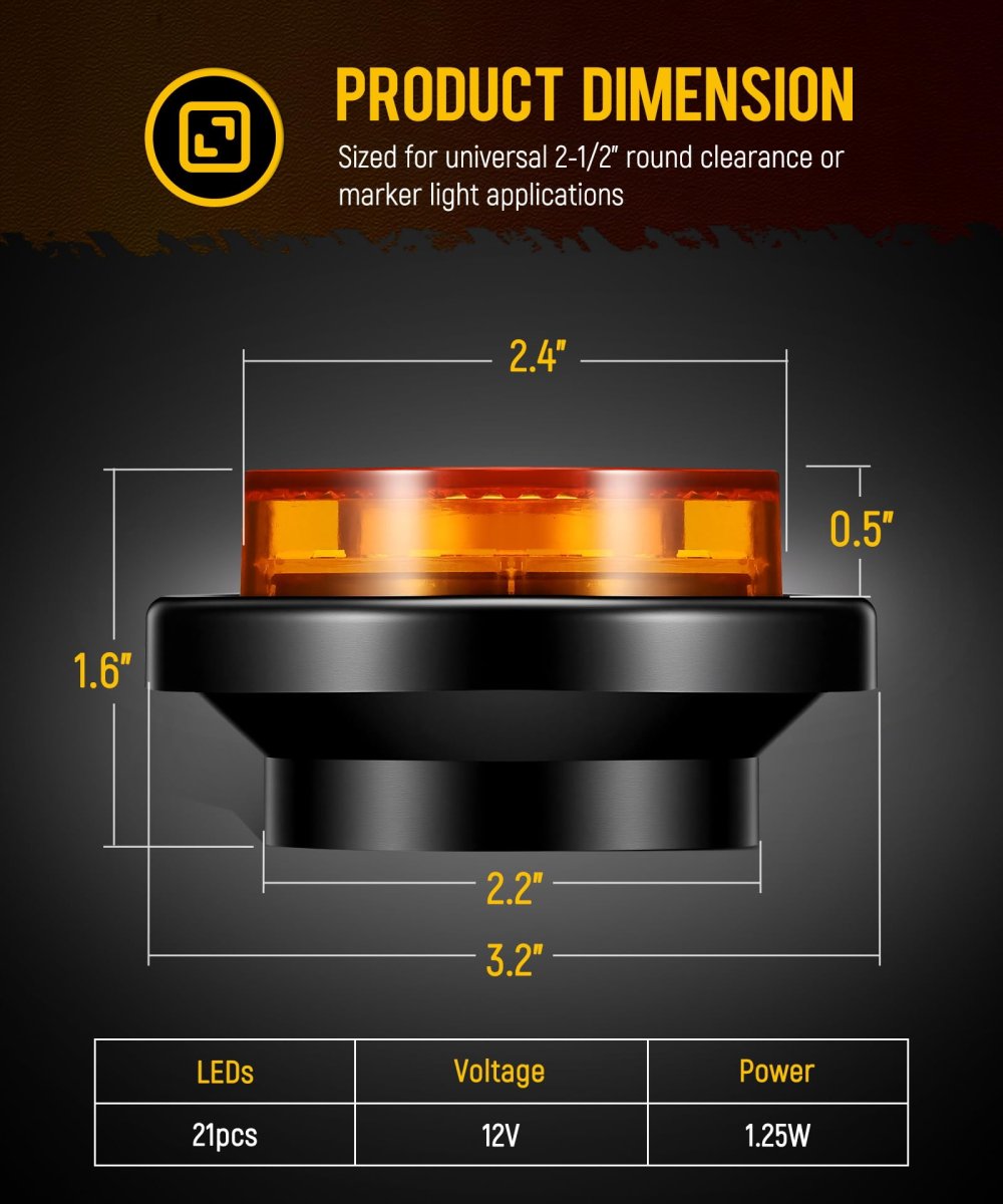 [Super Bright] 21 high-intensity LED for superior brightness and visibility, used as side marker or clearance light, allowing your vehicle to be more visible at night. [Durable & Weatherproof] IP65 waterproof grade, Impact-resistant lens is sonically sealed to ensure protection against dust and water exposure. [Simple Installation] Equipped with 2-pin male contact plug (Black Wire=Ground, Red Wire=Positive), Easily mounts with a rubber push-in grommet, No screws required. [Wide Application] Universal for almost 12V vehicles, like semi-trucks,trailers, RVs, campers, Vans, flatbeds, box trucks, utility and service vehicles. [Package Include] 10x 2.5" LED Marker Lights10x 2-Pin Male Pigtails Wire Plugs.Other fine products