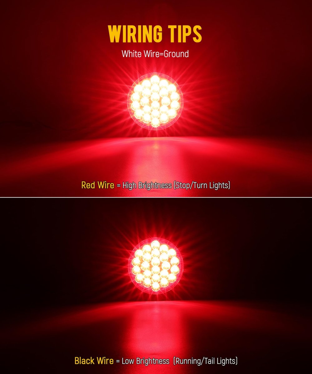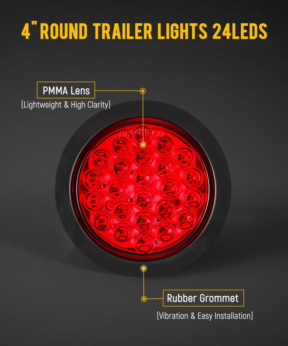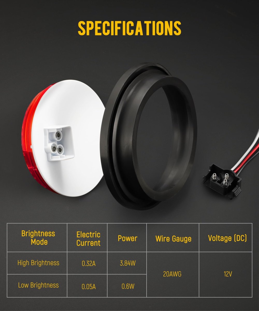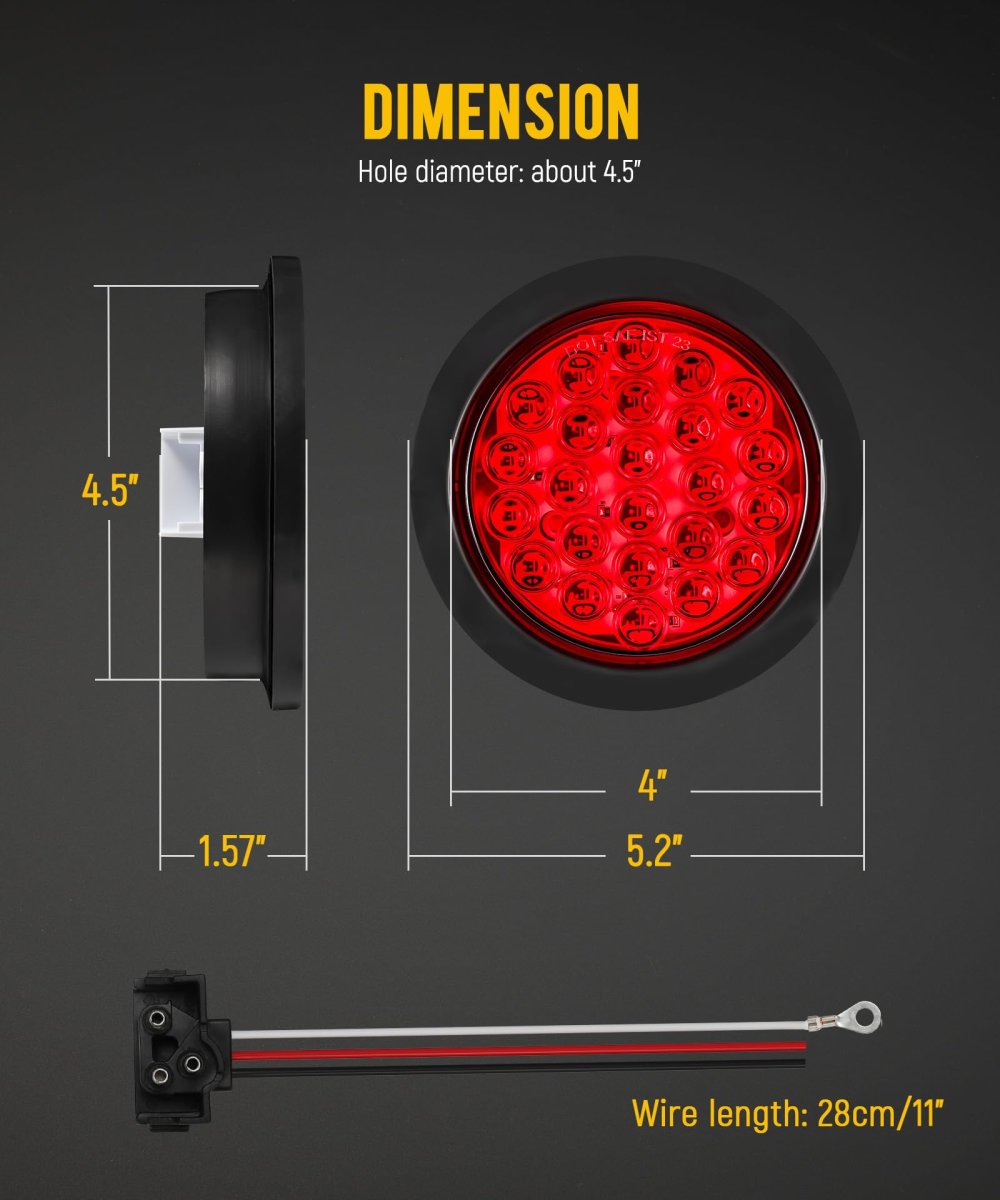 [Multi-Function Design] This 5-inch diameter waterproof trailer light features 24 LEDs and serves as a stop light, turn signal light, and tail light, ensuring versatility and safety on the road. [Weather-Resistant] With an IP65 rating, this light is engineered to withstand harsh conditions, effectively resisting sand, dust, dirt, rain, and snow. Its impact-resistant design minimizes shock damage. [Easy Installation] Simple wiring makes installation a breeze - white for ground, red for high brightness (stop/turn lights), and black for low brightness (tail/running lights). Compatible with standard 3-prong plugs (included). [Wide Compatibility] Designed for use with 12V DC systems, this tail light is compatible with a range of vehicles, including semi trucks, trailers, buses, and vans, making it a versatile choice for various applications. [Package Content] 10pcs round 24 led trailer lights with rubber grommets and 3-prong plugs.Other fine products