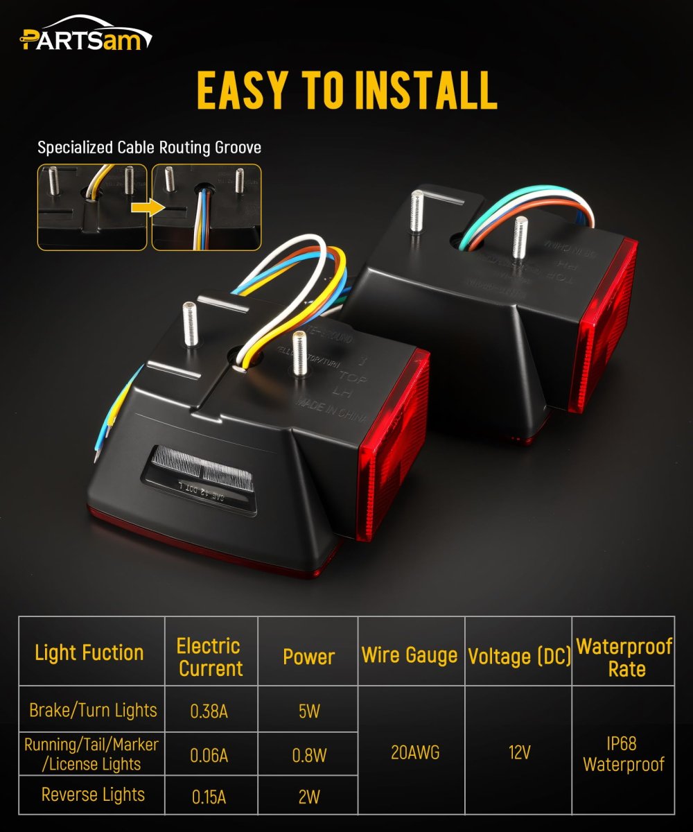 Bright LED Design: Features 21 diodes (13 red + 8 white) left side, 18 diodes (10 red + 8 white) right side, offering multi functions: stop/turn light, reverse/backup light, tail light/rear reflector, side marker/side reflector, and license plate light (left side ONLY). Wiring Tips: white wire=ground, yellow/green wire=high brightness (stop/turn lights), brown wire=low brightness (running/tail/side marker/license plate lights), blue wire=reverse/backup lights. Long-lasting Construction, IP68 Waterproof: Designed with impact-resistant PC lenses and ABS housing, these lights feature an IP68 waterproof rating, effectively blocking water and protecting internal circuits for harsh weather conditions. Universal Application: Compatible with a wide range of vehicles including trailers under 80", tractors, semi-trailers, dump trucks, etc. Package Content: The package includes two square trailer tail lights, gaskets, and screws, along with clear wiring details for straightforward installation on boat trailers, or utility trailers. (NOT included wire harness).Other fine products