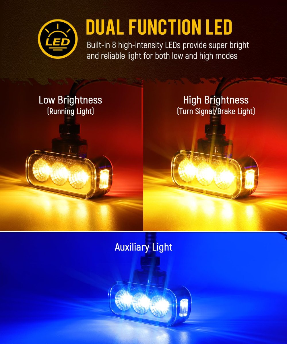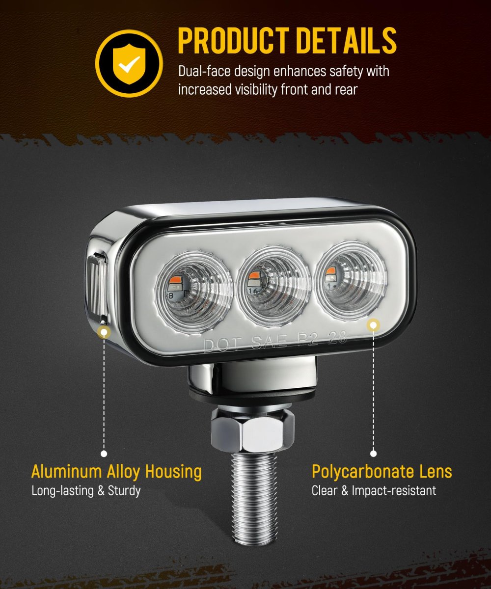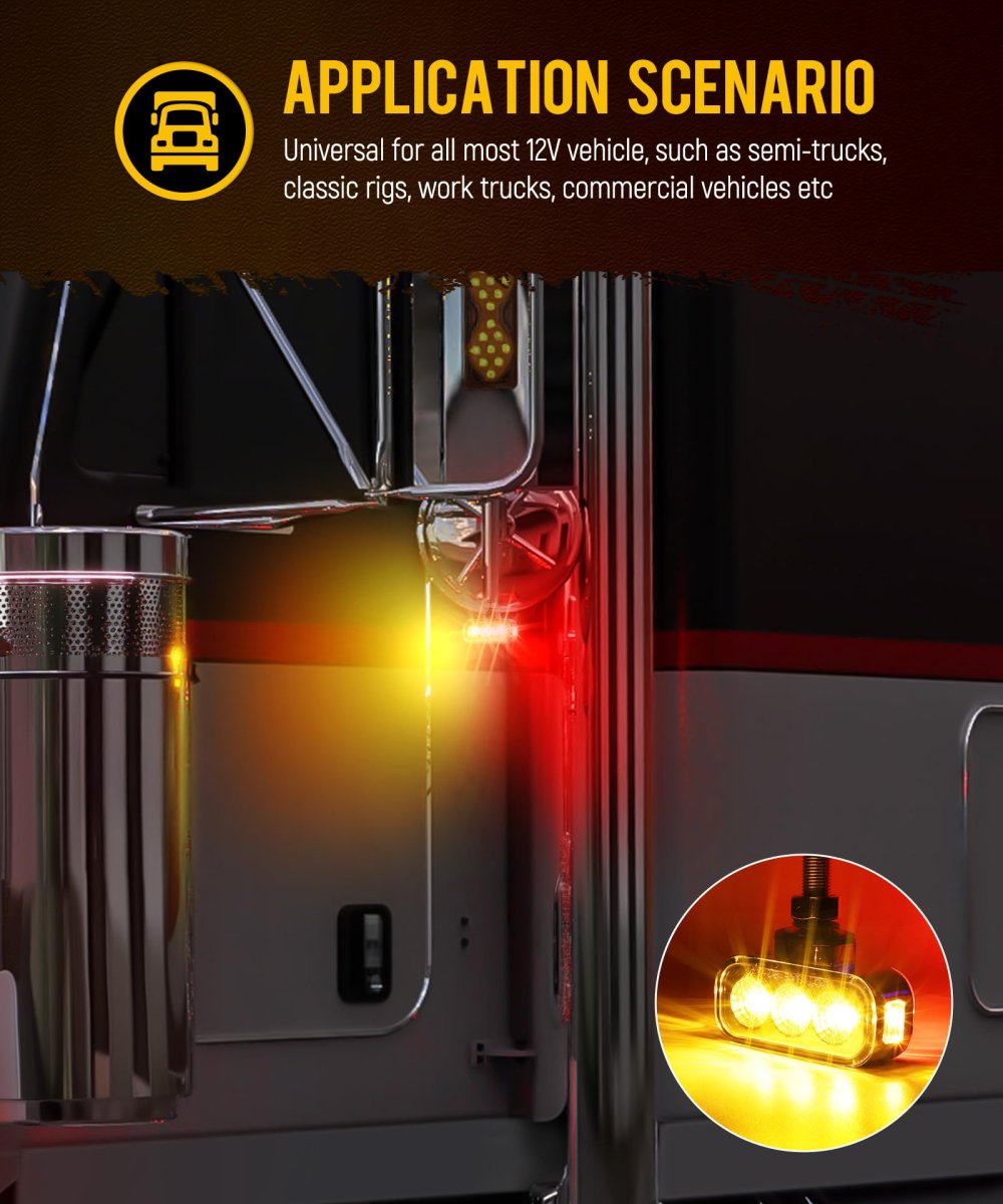 [Super Bright] The Dual Revolution led lights built-in 8pcs high intensity LEDs provides bright and reliable light,double-face design enhances safety with increased visibility front and rear. [Well Made] Impact-resistant polycarbonate lens and aluminum alloy housing for long-lasting durability. IP67 waterproof rating protect your lights from water, sand, dust, rain, snow, etc. [Simple Installation] Easy single stud mounting, can be placed on fender brackets, bumpers, or side rails. White=Ground, Red = High Brightness (Turn Singal/Brake Light),Black = Low Brightness (Running Light), Yellow=Auxiliary Light. [Wide Application ] Universal for all most 12V vehicle, such as semi-trucks, classic rigs, work trucks, custom show builds, and commercial vehicles etc. Also compatible with Peterbilt Kenworth Freightliner. [Package Include] 2x Rectangle Double Face Dual Revolution LED Lights.Other fine products