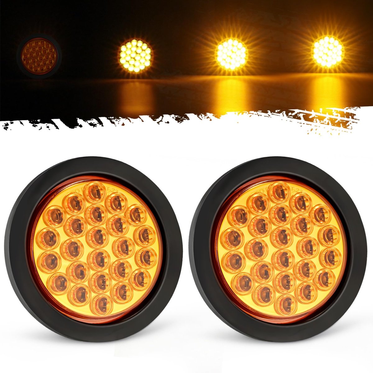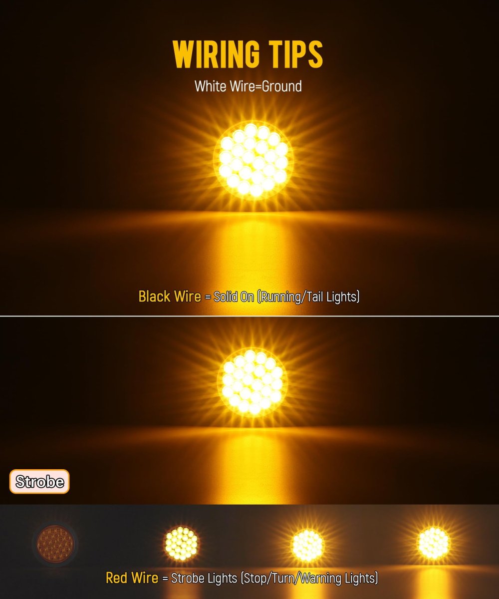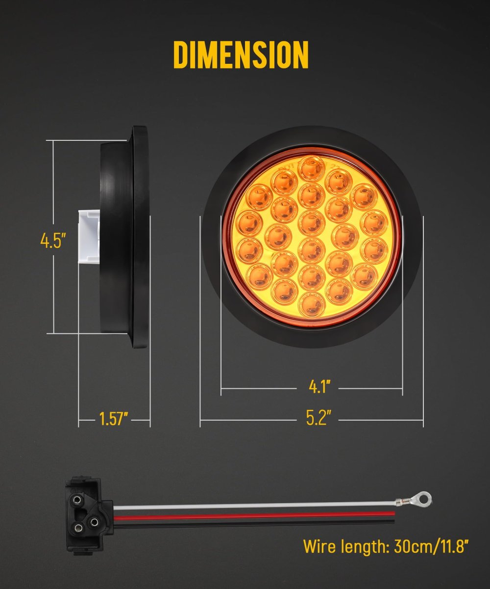 [Package Contents] Includes 2 4-inch amber round LED stop, turn, tail, and strobe lights with 24 LEDs; comes with round rubber grommets and standard 3-prong wire pigtails for easy installation. [Multi-Function Design] Serves as a stop, turn, and tail light combined with a strobe warning light; lights up amber color using the standard 3-prong wire pigtails. [Product Dimensions] Light measures approximately 4.1 inches in diameter and 1.05 inches in height; fits into a 5.2-inch round grommet. Requires a 4.5-inch hole for installation and connects easily with a standard 3-prong pigtail.. [Simple Wiring] Equipped with white wire for ground, black wire for solid on (running/tail lights), and red wire for strobe functions. [Wide Compatibility] Universal 4-inch round LED lights (12 volts DC) compatible with flatbed trucks, trailers, tractors, semi-trailers, dump trucks, buses, boats, and other specialized vehicles.Other fine products