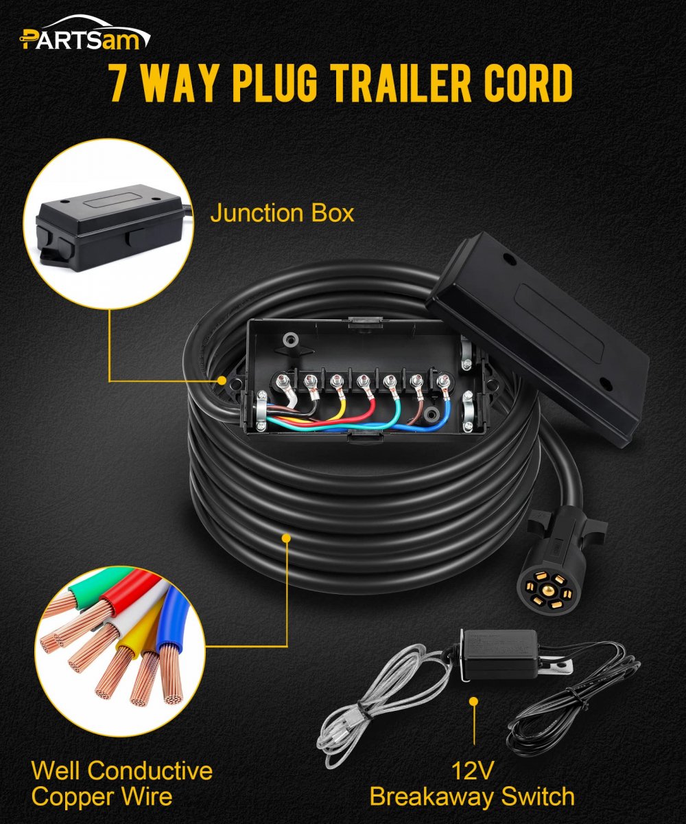 [Quick and Easy Connections] PARTSam 8ft trailer cord features a 7-way copper blade molded into a heavy-duty plug, which helps keep your wiring organized.. [Sturdy Junction Box] Enjoy convenient trailer wiring with a sturdy junction box. It features color-marked 7-poles for a hassle-free wiring experience for the left/right turn light brake signal lamp, reverse light, and tail light. It's much more manageable than handling loose wires.. [8ft Cord] Get a flexible connection with an 8ft long cord featuring soft and durable PVC housing. The length of the cord prevents it from being strained during an emergency turn. This 7-way connection links brake running, reverse turn signals, and auxiliary power.. [Waterproof] Ensure good sealing performance with provided rubber gaskets. 4 open and 4 closed sealed rubber gaskets are included, making the entire junction box waterproof, dustproof, and corrosion-proof.. [Wide Applications] Ideal for connecting the tail lights, brake lights, reverse lights, turn signals, and auxiliary power of your towed vehicles including trailers, RVs, campers, caravans, and food vans. Before operating the product, check the diagram to ensure proper installation..Other fine products