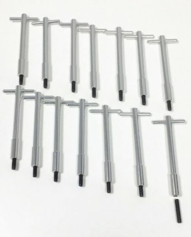 Silver Anodized Aluminum Valve Cover T-Bar Set Of 14 With Removable 1/4"-20 Stud. Light Weight (1 OUNCE EACH), Total Length: 4-13/16" , Threads: 1/4-20 x 1-1/4". Long Lasting Hard Anodized Aluminum Finish. Fits: Chevy V8 1955-1986, Chrysler V8 (except Hemi) 1959-1990, Ford V8 260-351W 1964-1990, Ford V8 429-460 1958-1998, Oldsmodbile V8 1958-1979. Set Of 14.Other fine products