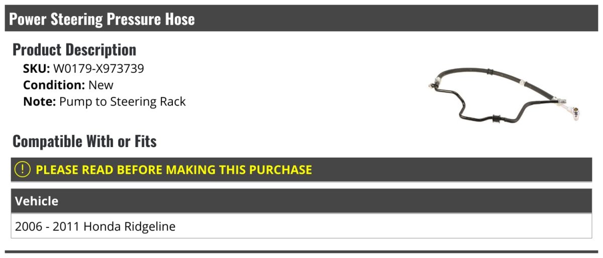 Pump to Steering Rack. Compatible with or fits: 2006 - 2011 Honda Ridgeline. Power Steering Pressure Hose. Review Description to Ensure Proper Fit.