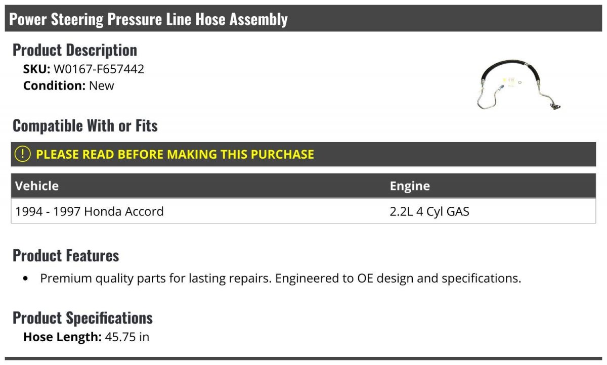 - Power Steering Pressure Line Hose Assembly Compatible With 1994-1997 Honda Accord 2 2l 4-cylinder Gas