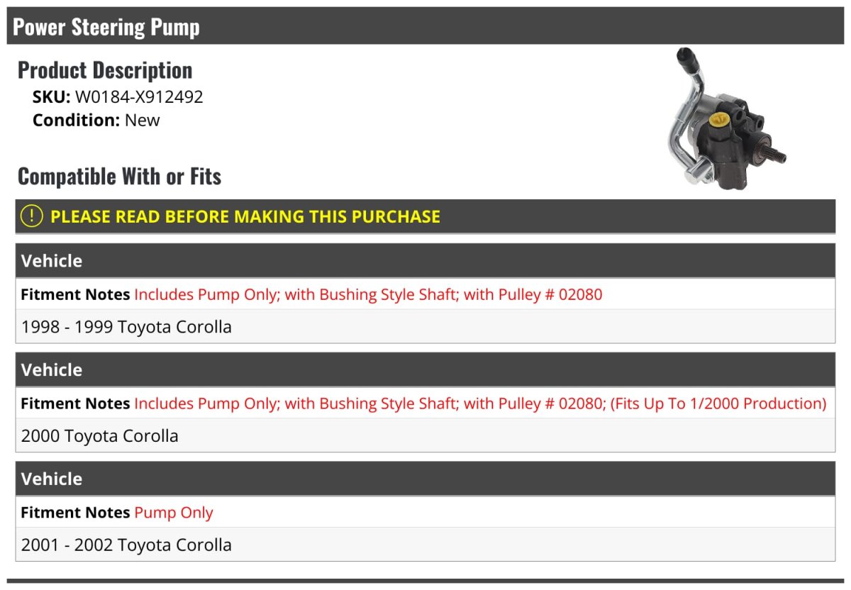 Compatible with or fits: (Note: Includes Pump Only; with Bushing Style Shaft) 1998 - 1999 Toyota Corolla. Compatible with or fits: (Note: Includes Pump Only; with Bushing Style Shaft) 2000 Toyota Corolla - Fits Up To 1/2000 Vehicle Production. Compatible with or fits: (Note: Includes Pump Only) 2001 - 2002 Toyota Corolla. OE Quality. Review Description to Ensure Proper Fit.Other fine products