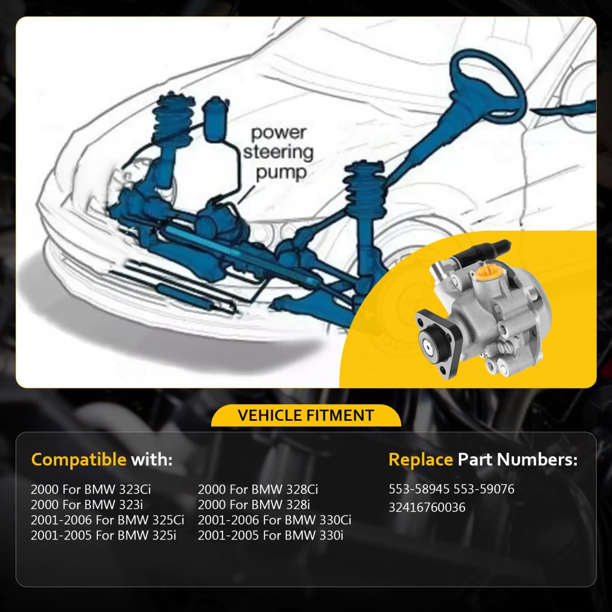 Vehicle Fitment:The power steering pump fits for 2000 For BMW 323Ci,2000 For BMW 323i,2001-2006 For BMW 325Ci,2001-2005 For BMW 325i,2000 For BMW 328Ci,2000 For BMW 328i,2001-2006 For BMW 330Ci,2001-2005 For BMW 330i. Replace Part Numbers: 553-58945 553-59076 32416760036,Easy to installation,OEM-standard design fits a wide range of vehicle models, ensuring quick installation without the need for complex modifications. Durable Materials:Made from premium wear-resistant materials, it offers excellent high-temperature and corrosion resistance, suitable for various harsh driving conditions. Low Noise Operation:Innovative noise reduction technology significantly reduces operational noise, providing a quieter driving experienceAdvanced hydraulic design and high-precision manufacturing ensure the power steering pump responds quickly to driver inputs.Other fine products