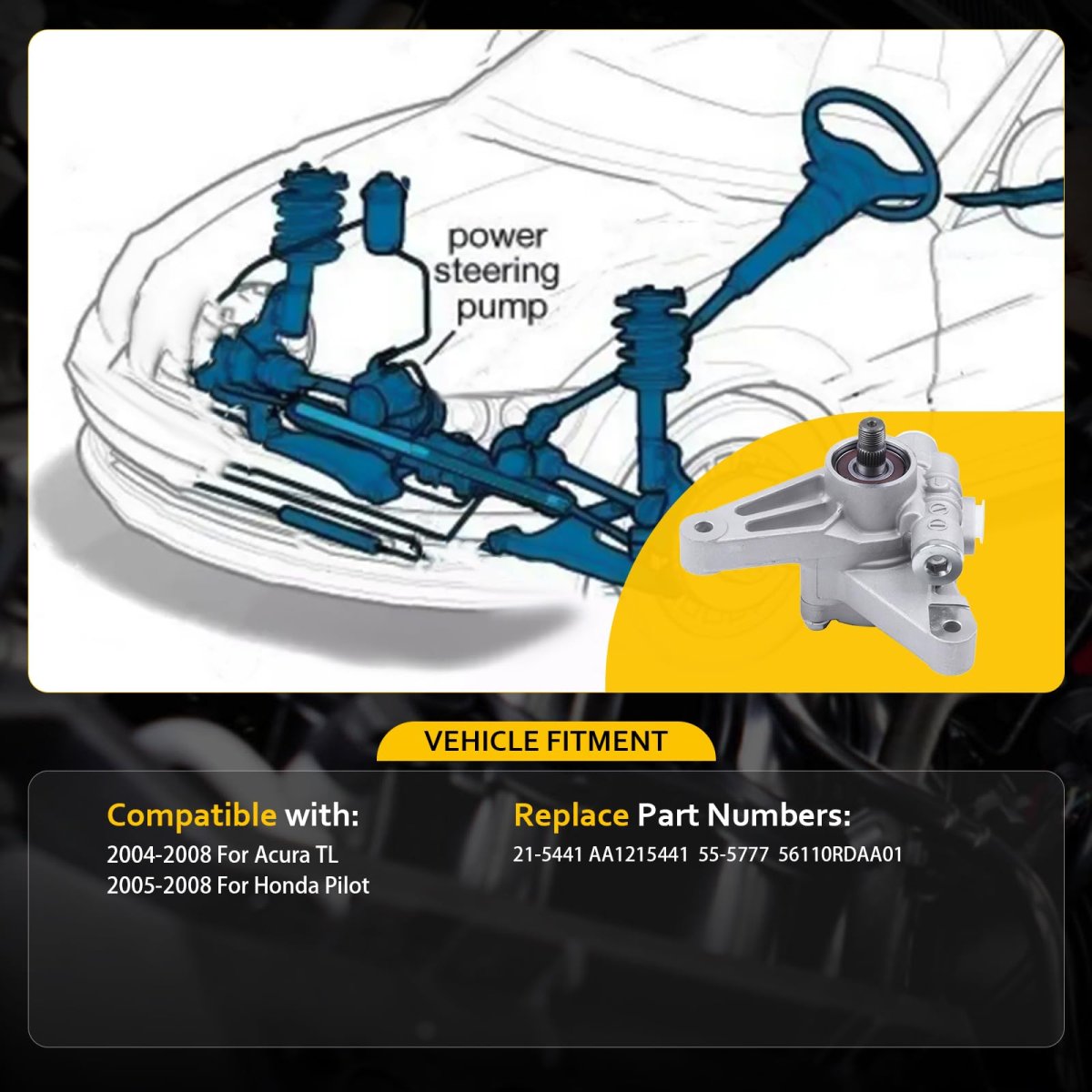 Vehicle Fitment:The power steering pump fits for 2004-2008 For Acura TL,2005-2008 For Honda Pilot. Replace Part Numbers: 21-5441 AA1215441 55-5777 56110RDAA01,Easy to installation,OEM-standard design fits a wide range of vehicle models, ensuring quick installation without the need for complex modifications. Durable Materials:Made from premium wear-resistant materials, it offers excellent high-temperature and corrosion resistance, suitable for various harsh driving conditions. Low Noise Operation:Innovative noise reduction technology significantly reduces operational noise, providing a quieter driving experienceAdvanced hydraulic design and high-precision manufacturing ensure the power steering pump responds quickly to driver inputs.Other fine products