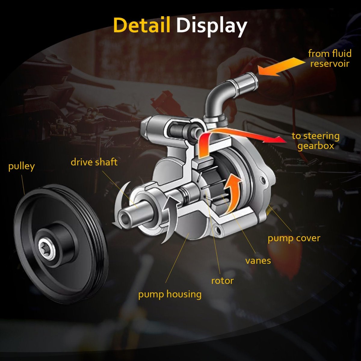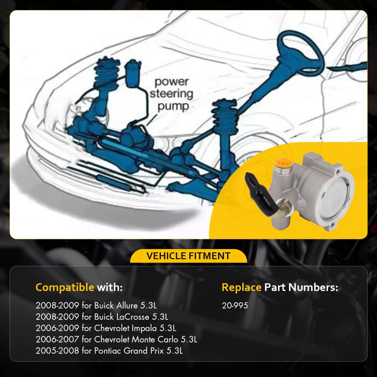 Vehicle Fitment:The power steering pump fits for 2008-2009 For Buick Allure 5.3L,2008-2009 For Buick LaCrosse 5.3L,2006-2009 For Chevy Impala 5.3L,2006-2007 For Chevy Monte Carlo 5.3L,2005-2008 For Pontiac Grand Prix 5.3L. Replace Part Numbers: 20-995,Easy to installation,OEM-standard design fits a wide range of vehicle models, ensuring quick installation without the need for complex modifications. Durable Materials:Made from premium wear-resistant materials, it offers excellent high-temperature and corrosion resistance, suitable for various harsh driving conditions. Low Noise Operation:Innovative noise reduction technology significantly reduces operational noise, providing a quieter driving experienceAdvanced hydraulic design and high-precision manufacturing ensure the power steering pump responds quickly to driver inputs.Other fine products