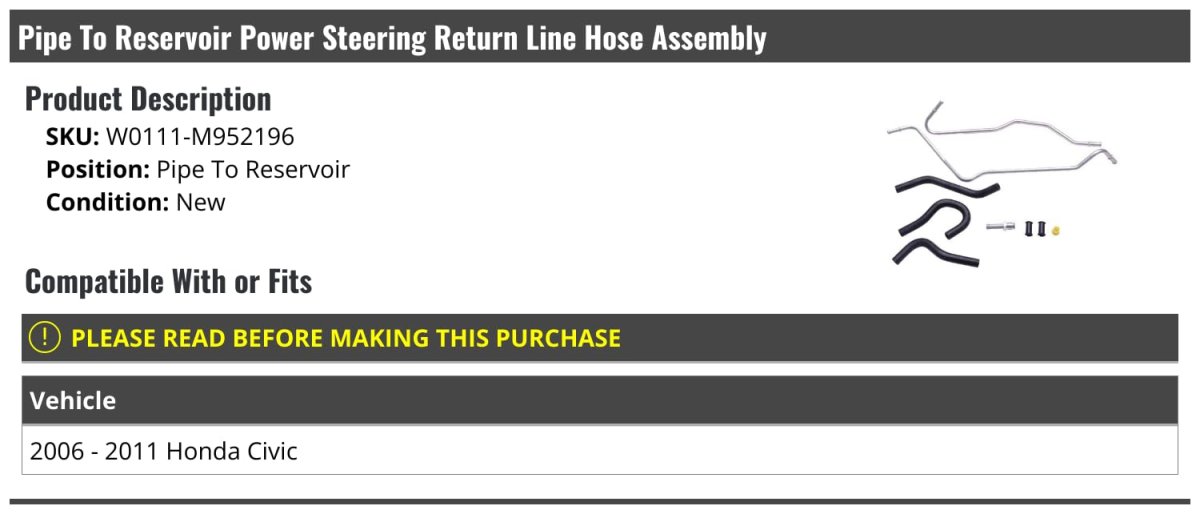 - Power Steering Return Line Hose Assembly To Reservoir For 2006-2011 Honda Civic
