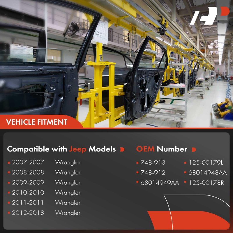 Directly FitOE Replacement Power Window Regulator with 2 Pins Motor, Directly Fit. Vehicle FitmentCompatible with Jeep Wrangler 2007-2017 Sport Utility, Wrangler JK 2018 Sport Utility --- Front Driver and Passenger Side. PositionFront Left and Right, Driver and Passenger Side. Reference NumberThe A-Premium window regulator's reference number: 68014949AA, 125-00179L, 12500179L, 68014948AA, 125-00178R, 12500178R, 748-912, 748912, 748-913, 748913.Other fine products