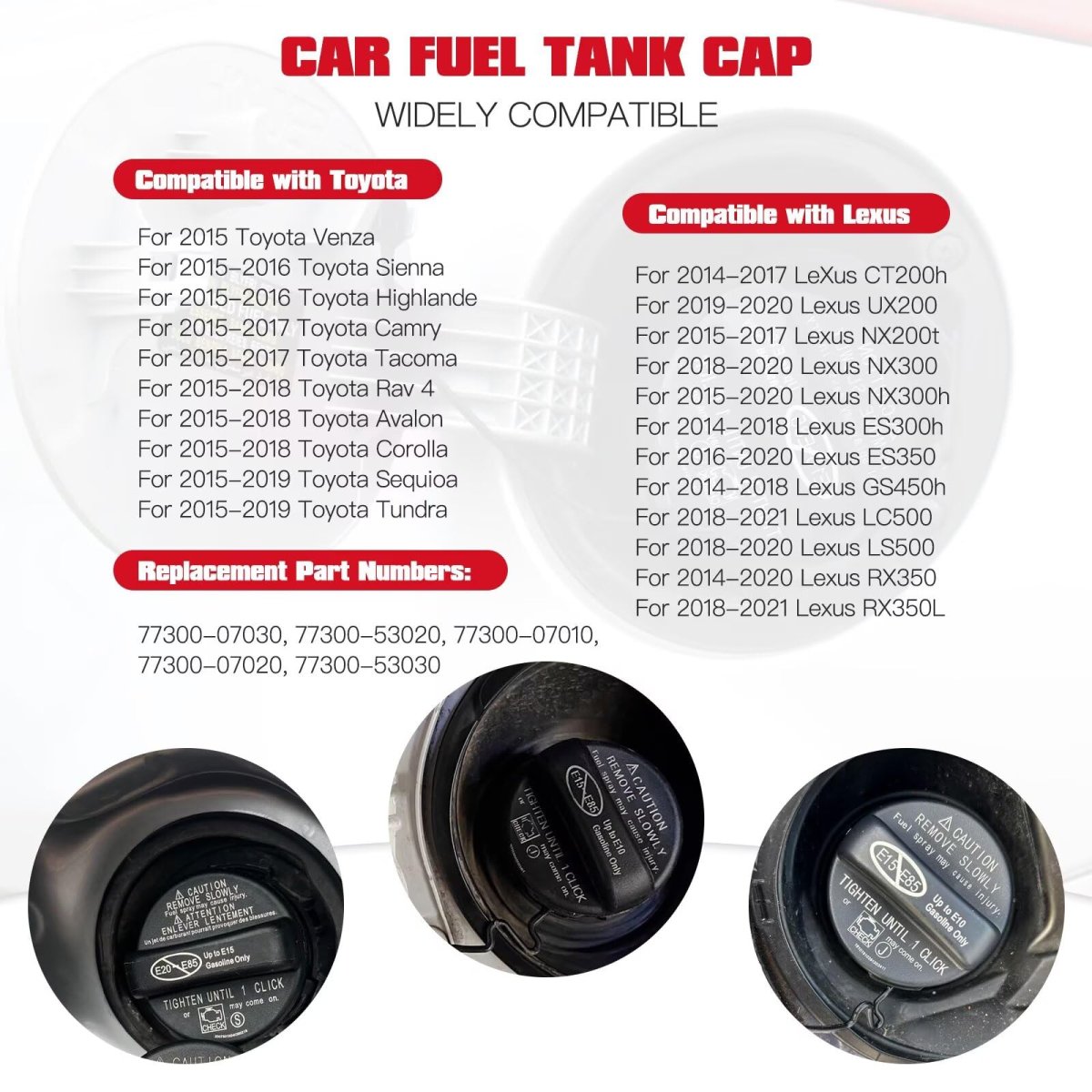- Premium Gas Cap Fuel 77300-07030 For 2014-2021 Toyota Venza Highlander Sienna Tacoma Camry Rav4 Corolla Avalon Tundra Sequioa