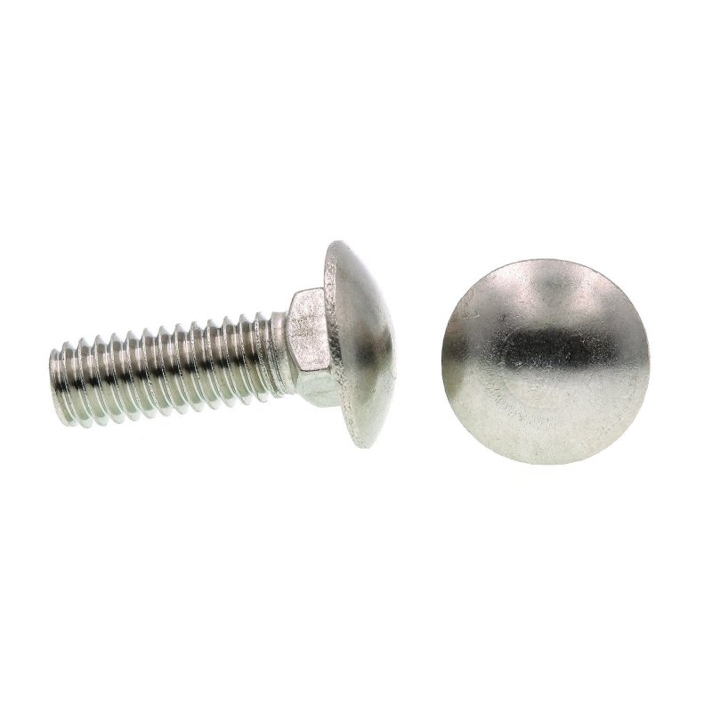 Size: 5/16 inch-18 X 1 inch. Features a smooth rounded head as opposed to a standard hex head. Square shoulder allows for nut to be tightened or loosened. Often used in cases where a protruding bolt head could cause injury. Nuts and washers not included, ensure washers and nuts are same diameter.