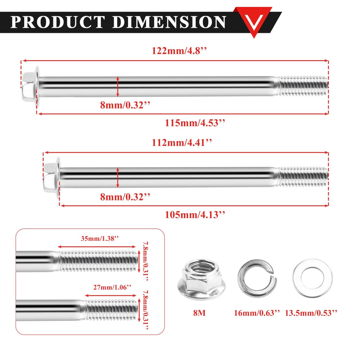 This 8mm engine mounting bolts fits almost every pit bike engine from 50cc - 125cc Pit Pro ATV Dirt Quad Bike. Bolt 1: Length 115mm (not including bolt head); Thickness 8mm. Bolt 2: Length 105mm (not including bolt head); Thickness 8mm. Included in the set: 1 x 115mm Bolt, 1 x 105mm Bolt, 4 x Washers, 2 x Spring washers.Other fine products