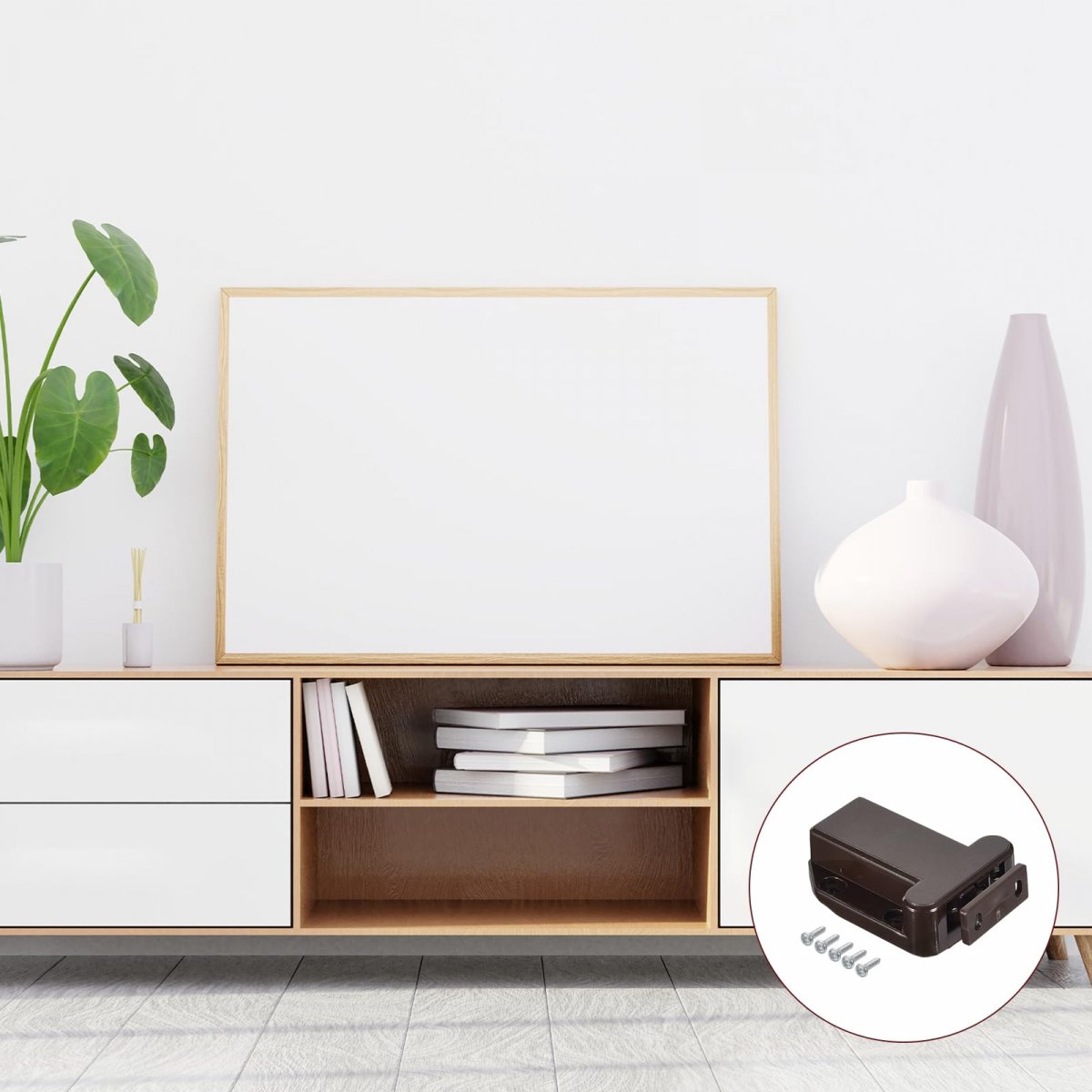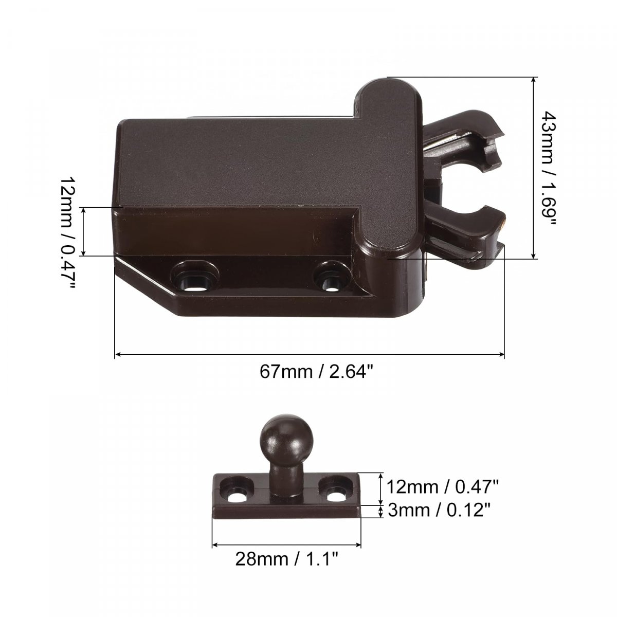 Dimensions: Base Size: 67 x 43 x 12mm / 2.64" x 1.69" x 0.47"(L*W*T); Strike Size: 28 x 12 x 3mm/1.1" x 0.47" x 0.12"(L*W*T). Advantages: Made of sturdy and durable ABS material, which is resistant to high temperatures, and not easy to wear or fade. The structure is small and compact, taking up no space, and it has a built-in spring that can open and close smoothly.. Application: The touch latch can open or close the lock simply by pushing it, which is convenient and fast. Suitable for drawers that are frequently used or have no handles, such as chests of drawers, tool boxes, mailboxes, bookcases, TV cabinets, etc.. Installation: Attach screws and drill holes for installation on both sides, normally one at the inner bottom of the drawer and the other at the drawer door. After selecting the location, drill holes for installation.. Note: Adhesive installation is also possible, but adhesive is not provided here..Other fine products