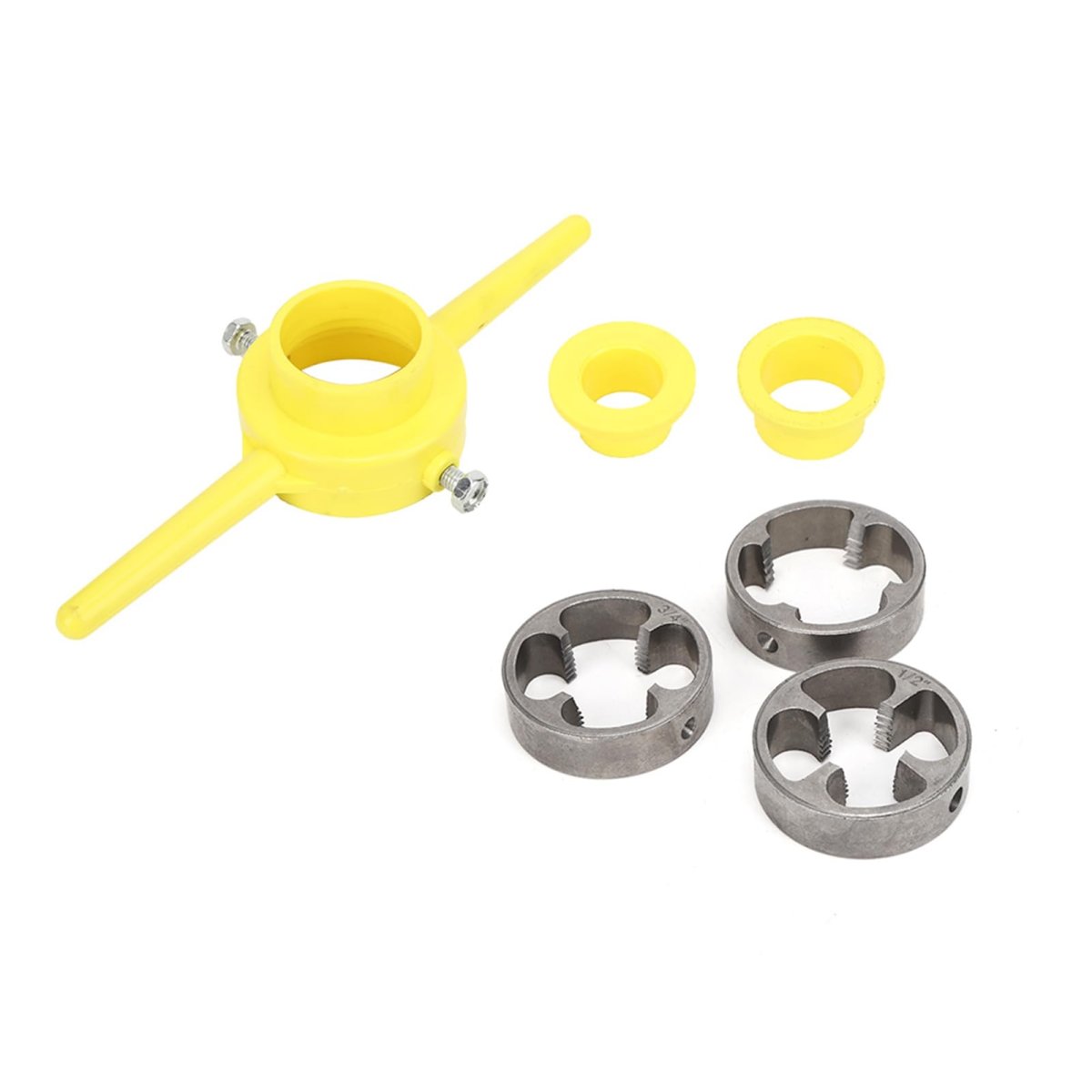 [ROBUST BUILD]: Crafted with sturdy plastic and alloy materials for performance.. [UNIVERSAL FIT]: Compatible with different pipe sizes: 1/2 inch, 3/4 inch, and 1 inch.. [CONVENIENT SET]: Complete set includes three thread and two round dies.. [PROFESSIONAL THREADS]: Create professional-grade threads effortlessly with this manual hand tool.. [TIME-SAVING]: Enables efficient pipe threading, saving you time and effort..Other fine products