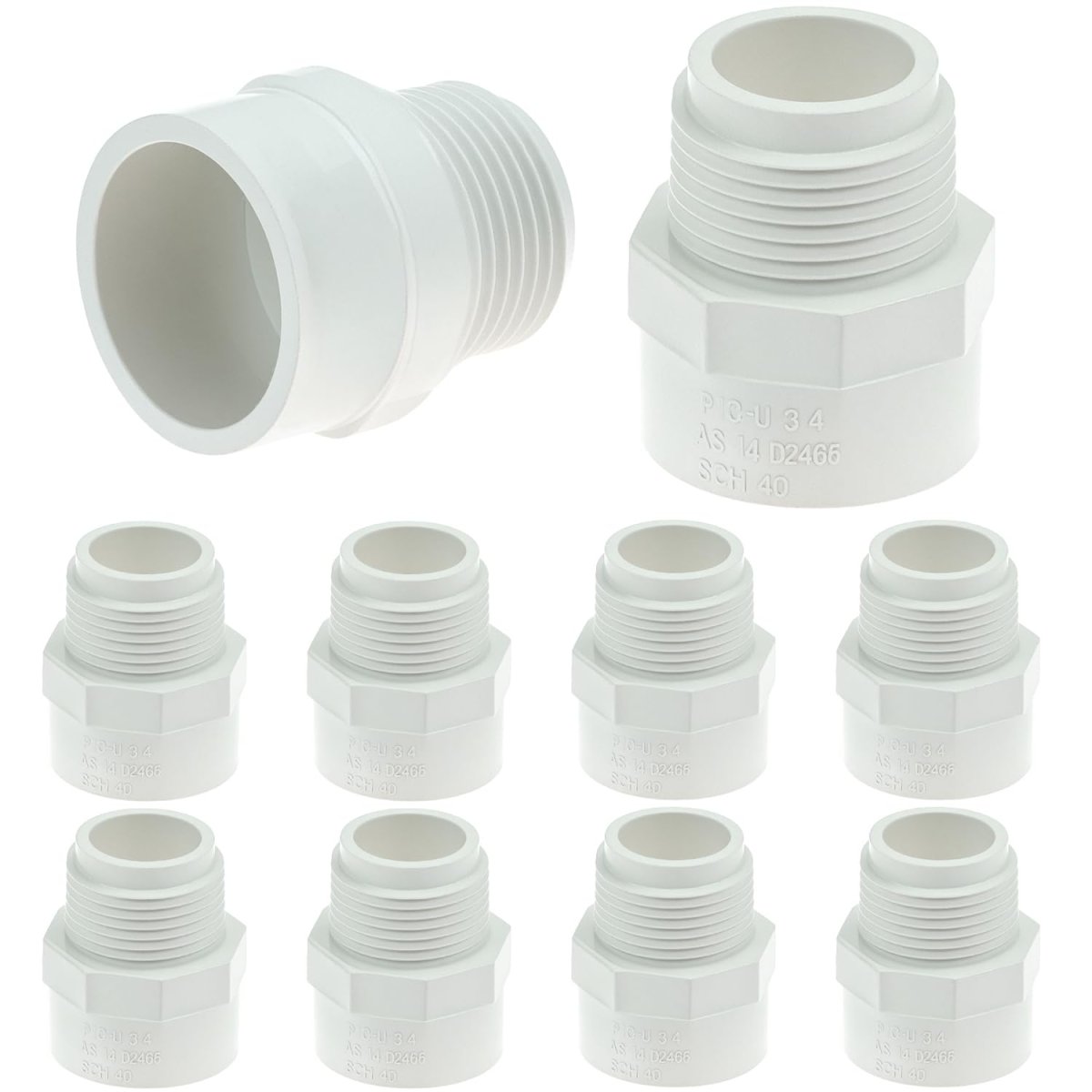 Package: 10 pieces. Size: 3/4 Inch. For connecting pipes or fittings of different types.. Connections: Slip opening on one end and male NPT threads on the other.. Installation Requirements: Requires primer, solvent cement, and PTFE Industrial Sealant Tape (PTFE tape or pipe dope).. Material: PVC, lightweight, easy to install, corrosion resistance, high strength.. Recommendations for Use: Irrigation, underground sprinkler systems, swimming pools, outdoor applications, cold water supply lines, rainwater collection systems (not for drinking water).Other fine products