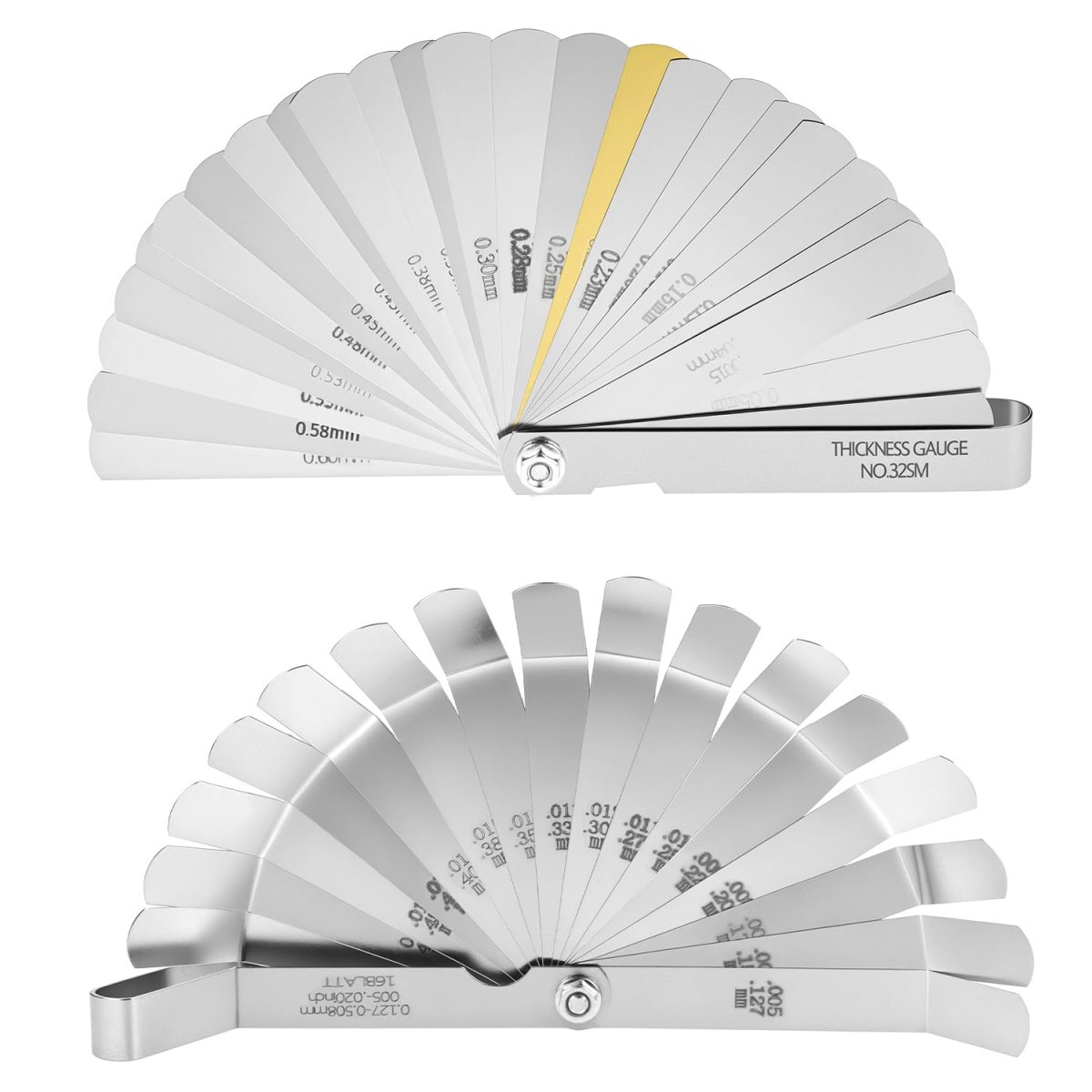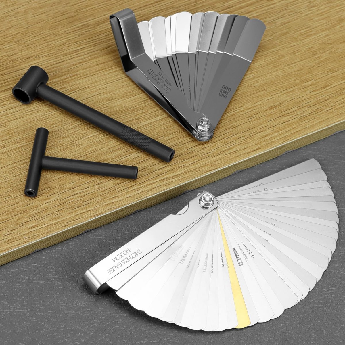 Package: 4 pcs Adjusting Valves Tool Set: 1 Square Hole Tool, 1 Hexagonal Hole Tool, 1 Straight Feeler Gauge, 1 Offset Feeler Gauge.. Square Hole Tool Size: Approx 1.93"2.68". Hexagonal Hole Tool Size: 0.87"4.33". Square Hole Sizes: 4mm, 3mm, 3.5mm. Hexagonal Hole Sizes: 9mm, 10mm. Precision Measurements: Featuring 32 Straight Feeler Gauge Blades (0.04mm - 0.88mm) and 16 Offset Blades (0.127mm - 0.508mm) for accurate measuring in both metric and imperial units.. Application: Used for adjusting motorcycle engine valve screws, measuring tappet clearances, spark plug gaps, bearing clearances, piston ring gaps.. Materials: Crafted from quality metal with 65 Manganese Steel feeler gauges, and coated with anti-rust oil to ensure long-lasting performance..Other fine products