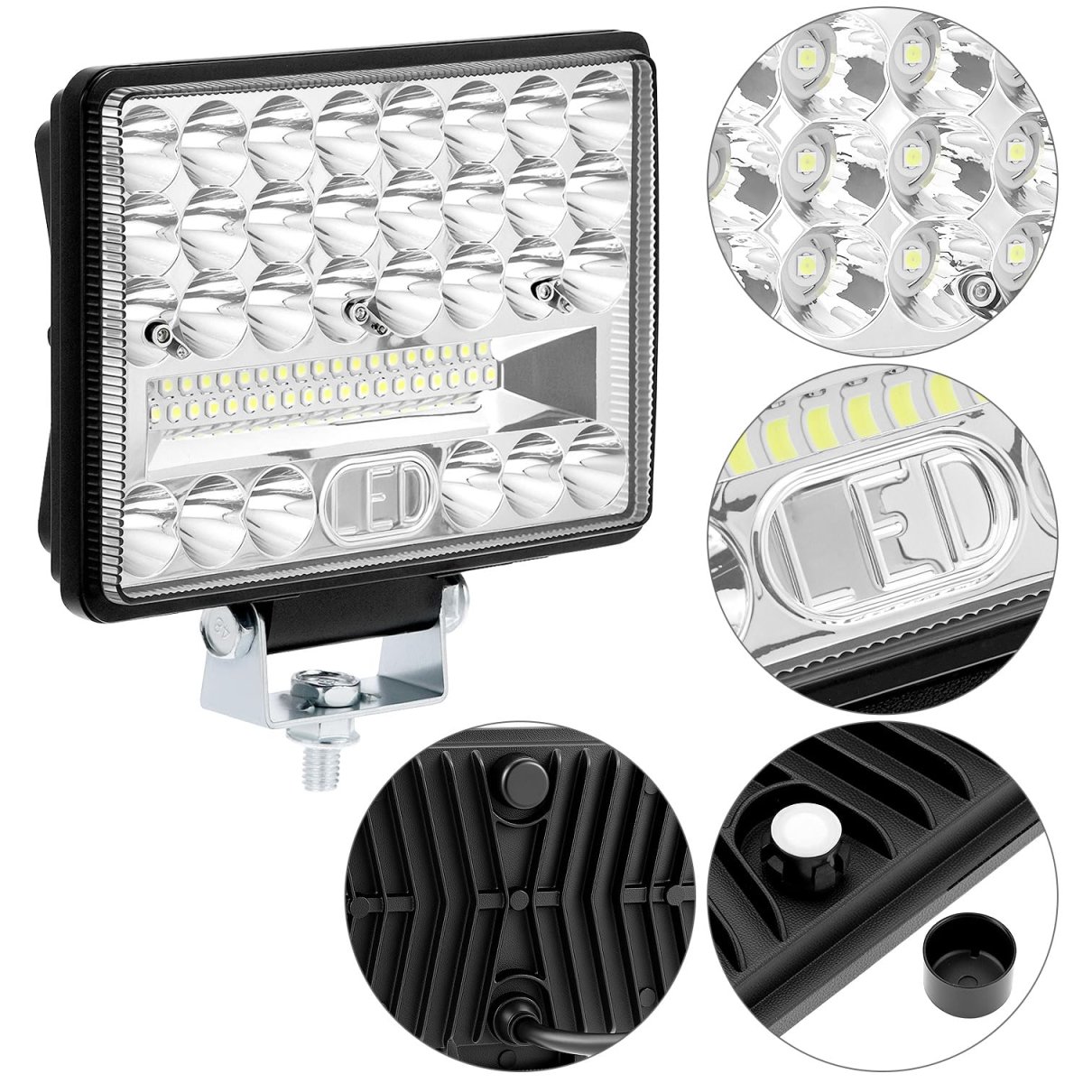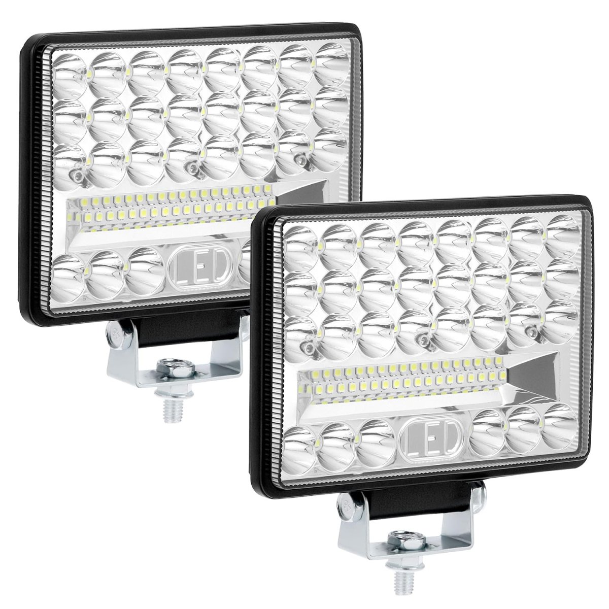 High Performance: Featuring a theoretical output of 80W per pair and actual 71.04W at 12V, these LED work lights deliver a powerful 6800 lumens, ensuring excellent visibility in all conditions.. Wide Illumination Angle: Designed with a 150-degree illumination angle, these lights provide broad and efficient coverage, making them perfect for a range of applications from off-road adventures to work on farms and construction sites.. Rugged Construction: Built to withstand tough settings, the 2 Pack lights boast an aluminum housing and stainless steel mounting bracket, offering both durability and stability.. Versatile Voltage Range: With a DC voltage range of 9V to 30V, these lights are compatible with both 12V and 24V vehicles, including trucks, jeeps, tractors, SUVs, ATVs, UTVs, and more.. Multipurpose Use: Ideal for a wide variety of vehicles and settings, the lights are suitable not only for land-based vehicles like skid steers and excavators but also for marine applications such as boats..Other fine products