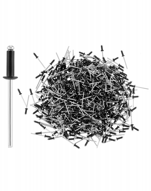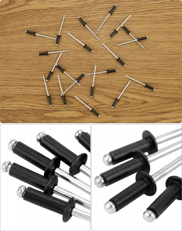 Aluminum Rivets: Large flange rivets are made with aluminum handles and steel mandrels, corrosion and acid resistance, high strength, used for a long time.. Diameter: 1/8", Grip Range: 3/8".. Excellent Performance: This large flange aluminum blind rivet can increase the connection area with the plate to increase the force bearing area. The thick shaft ensures a secure hold and pops out when tightened, easy to install.. Wide Application: These black rivets are very strong and perfect for both indoor and outdoor use, perfect for joining various metal plates and pipes.. Package Includes: 500 Pcs aluminum blind rivets, 1/8" x 3/8"..Other fine products