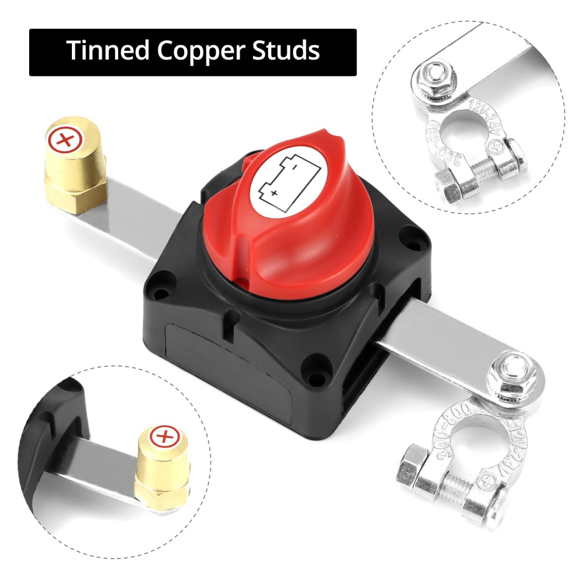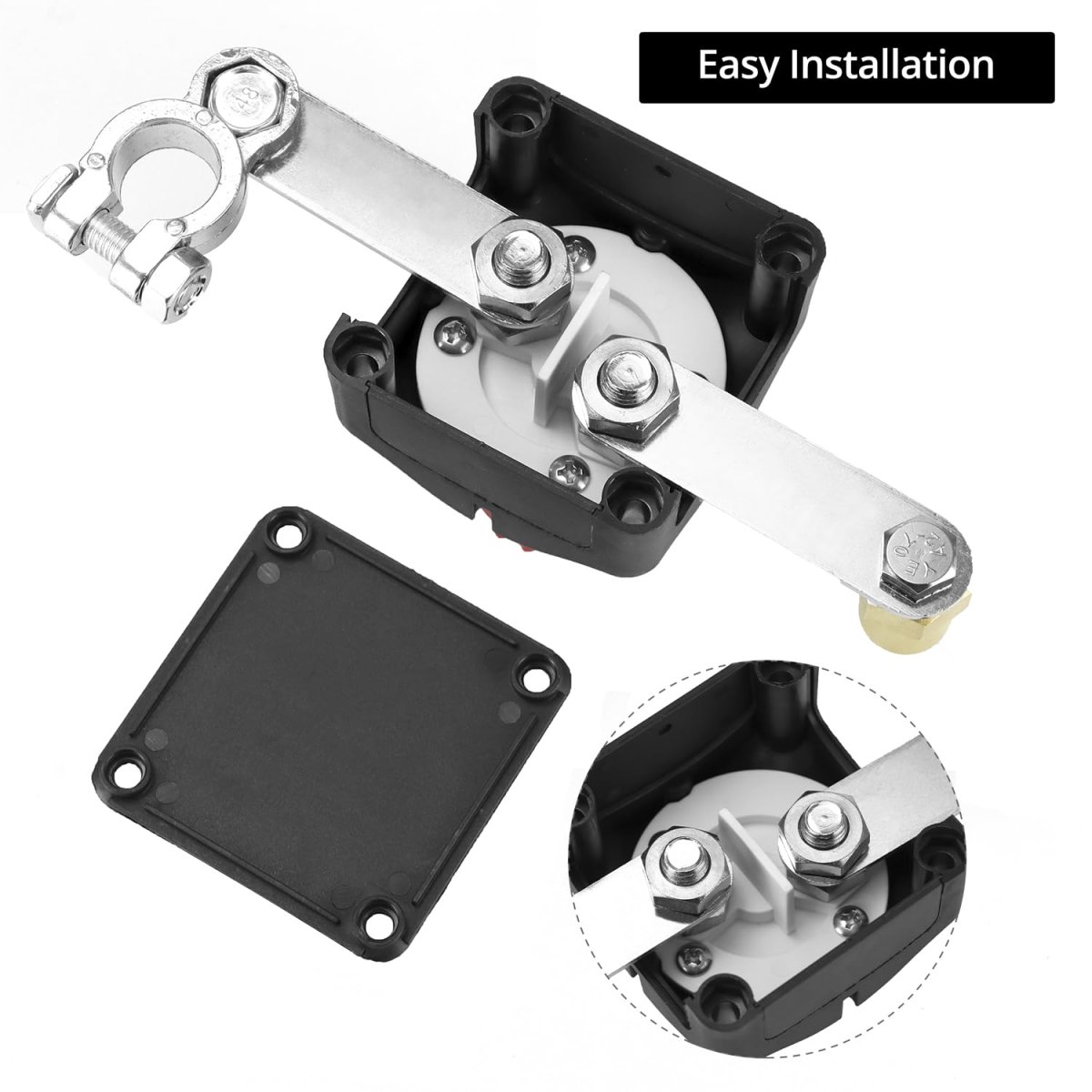 Compatibility: Suitable for cars, boats, RVs, campers, travel trailers, trucks, ATVs, UTVs, battery banks, and other electrical equipment, with support for DC 12-48V systems.. Robust Performance: Features a continuous rating of 275A DC for 1 hour and a cranking rating of 1250A DC for 10 seconds.. Materials: Constructed with ABS plastic and M10 tinned copper studs, offering excellent stability and electrical conductivity.. Installation: Designed for simple installation on the positive battery terminal, complete with 2 copper conductive sheets, mounting brackets, and insulation to prevent short circuits.. Package: Includes 1 x Top Post Battery Disconnect Switch..Other fine products
