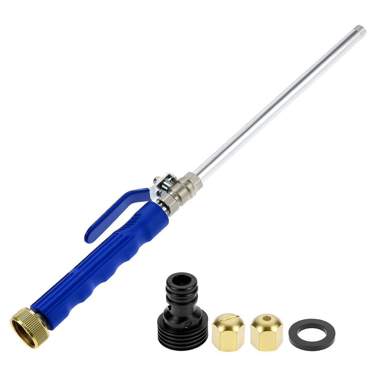 Multi-Purpose Cleaning Tool: This power washer wand is fit for garden watering, agricultural irrigation, car and pet washing, or household cleaning.. Universal Compatibility: Designed to easily connect with all 3/4" standard garden hoses and adaptable to 1" hose connectors, ensuring broad compatibility and hassle-free setup.. Versatile Spray Options: Comes with two spray tipsjet stream and fan sprayproviding flexible options for different cleaning tasks, from intense grime removal to gentle misting.. Materials: Constructed from rust and corrosion-resistant materials including a brass garden hose coupler and stainless steel wand, ensuring longevity and durability.. Enhanced Pressure Capabilities: Designed for a faster flow rate through small nozzles and compatible with high-pressure cleaning machines for extra power, making tough cleaning jobs easier..Other fine products