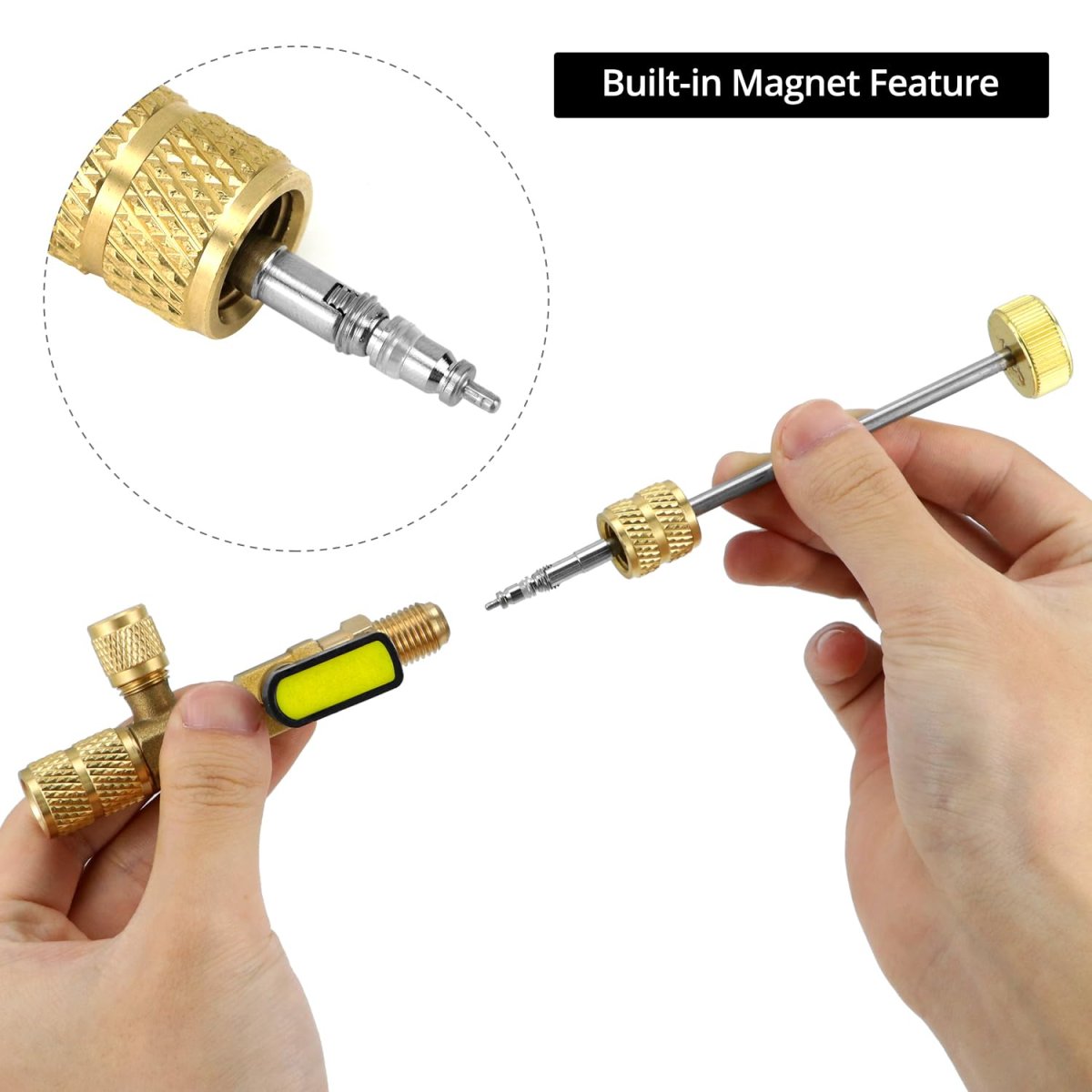 Versatile Compatibility: Designed for R22, R410a, R134, and R32 air conditioning systems, suitable for both mini split systems and 1/4" service valves on split systems.. Efficient Installation: Replace leaking valve cores swiftly and effortlessly without the need to evacuate the refrigerant, ensuring quick and hassle-free maintenance.. Dual Port Sizes: Equipped with dual size SAE 1/4" & 5/16" ports, accommodating various HVAC applications with one comprehensive tool.. Advanced Features: Equipped with a ball valve handle for easy operation, a durable metal cap, a core grabber tool, and a built-in magnet to secure metal parts.. Complete Package: Comes with one versatile valve core remover and installer tool, essential for air conditioning line repair and ongoing HVAC maintenance..Other fine products