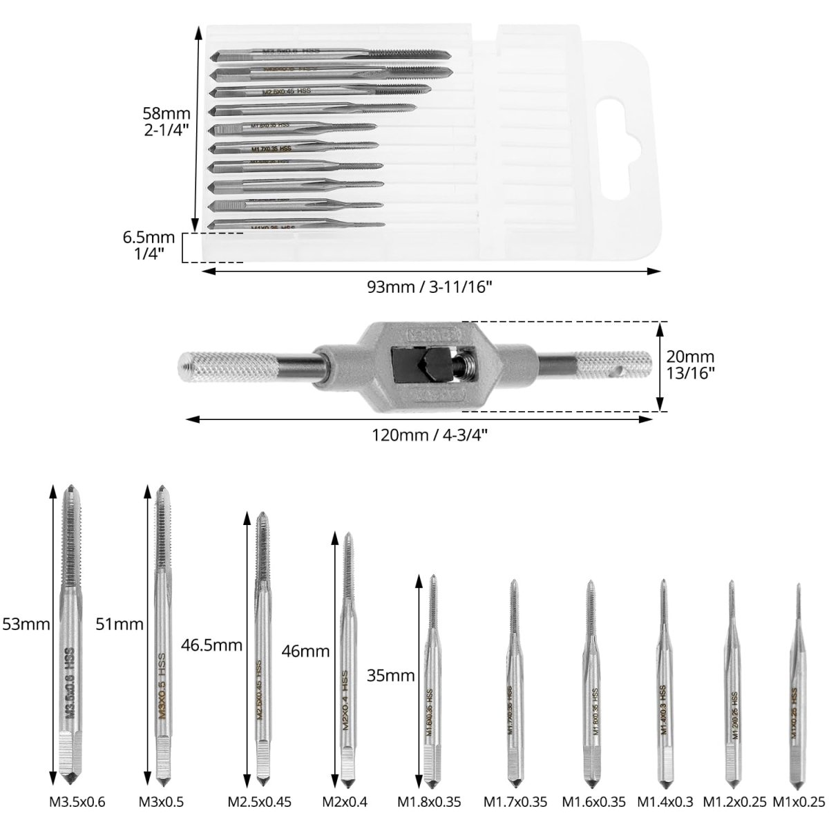 Material: Crafted from high-speed steel (HSS6542) for superior hardness, rust resistance, and exceptional durability.. Comprehensive Set: Includes 10 pieces with a range of metric tap sizes from M1 x 0.25 to M3.5 x 0.6, for various threading applications.. Precision Design: Features sharp, accurate cuts with standard metric threads, ensuring clean cuts and rapid chip removal without burrs.. Enhanced Functionality: Comes with an adjustable tap wrench compatible with metric sizes M1-M8 and UNC/UNF sizes ranging from 1/16" to 1/4" for diverse threading needs.. Applications: Perfect for machining nuts and common threads, this set is ideal for use on soft metals like aluminum, as well as wood and plastic materials..Other fine products