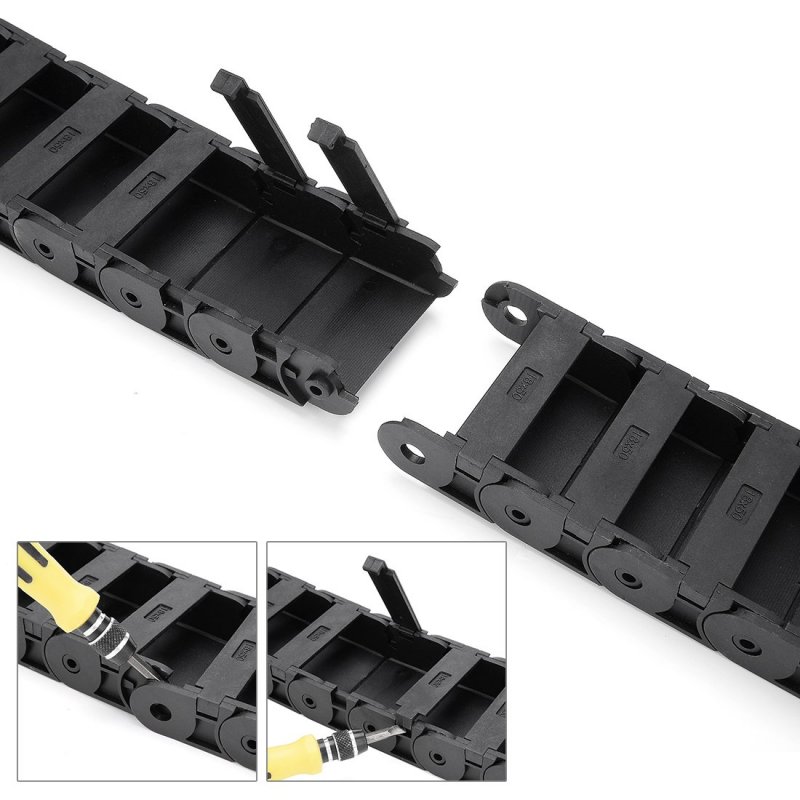 Internal Size: 18x50mm(0.59x1.969 inch);External Size: 23x61mm(0.906x2.4 inch); Bending radius: R38; Length: 1M(39.37inch). Change Size: You could link the cables with each other to form one long length you need.. Semi enclosed type, move flexibly. Reinforced nylon, low temperature resistance, wear resistance, corrosion resistance.. NOTE: When the moving terminal is bent as "U" shape, the longer part will lay flat. Or the tail of the chain will bend upward.. The Drag chain has been widely used in CNC machine tools, electronic equipment, fire machinery, stone machinery, glass machinery, doors and window machinery, injection machines, robots, overweight transportation equipment, automated warehouses and so on..Other fine products