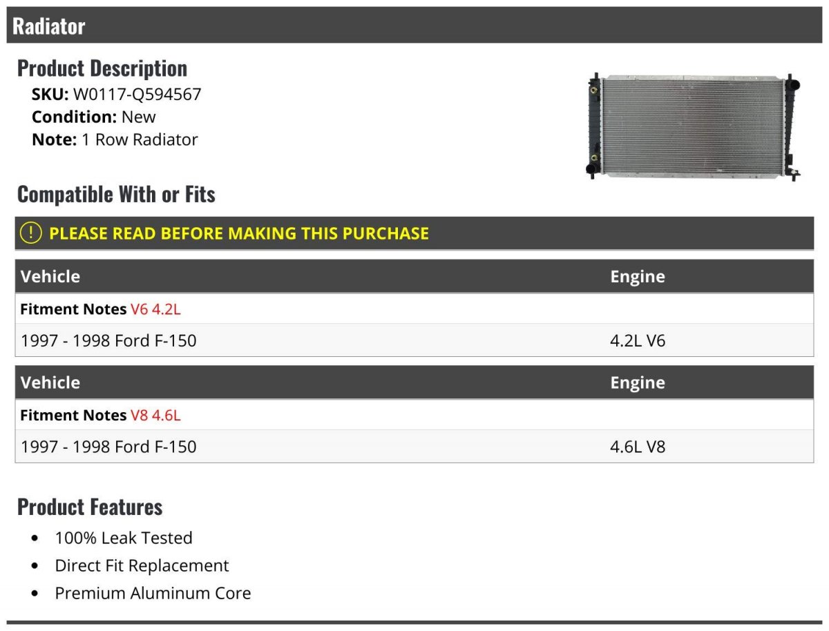 - Radiator Compatible With 1997-1998 Ford F-150 4 2l V6 6l V8