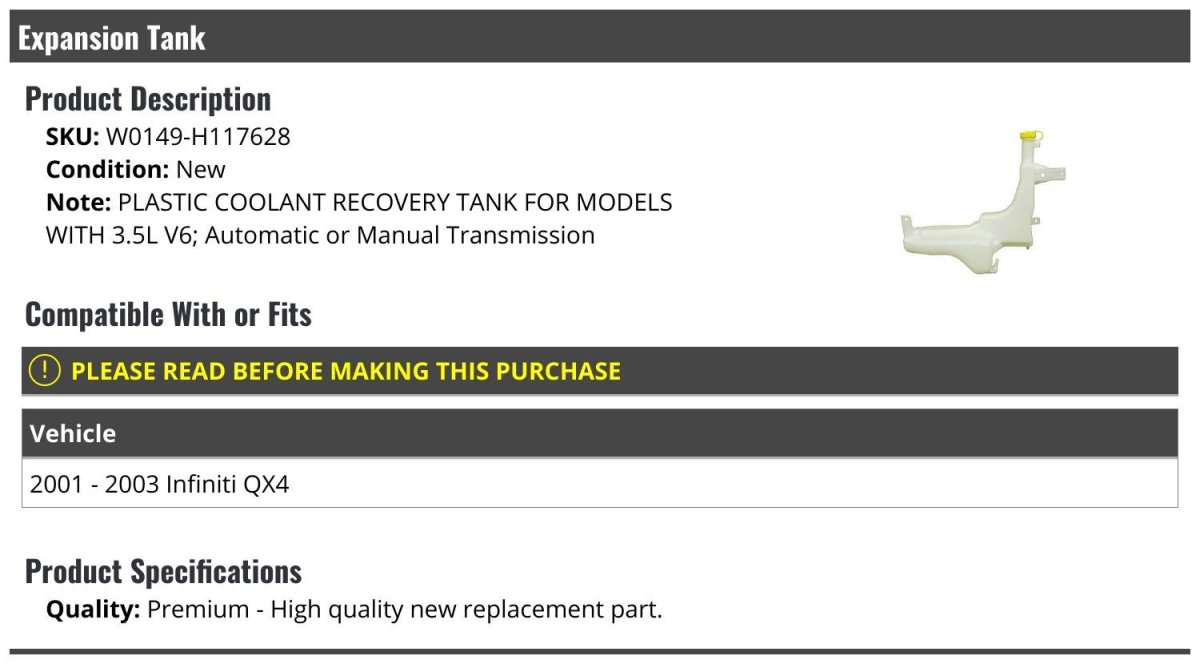 - Radiator Coolant Overflow Expansion Tank For 2001-2003 Infiniti Qx4 3 5l V6