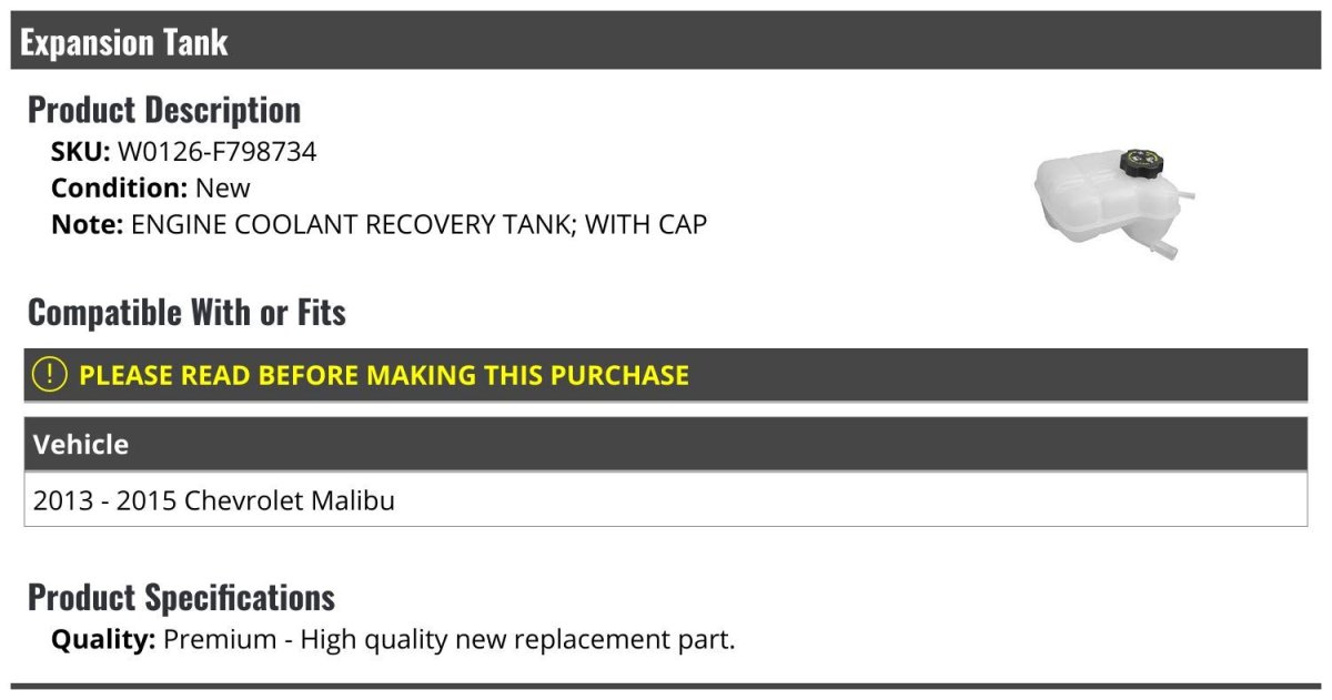 - Radiator Coolant Overflow Expansion Tank With Cap For 2013-2015 Chevy Malibu