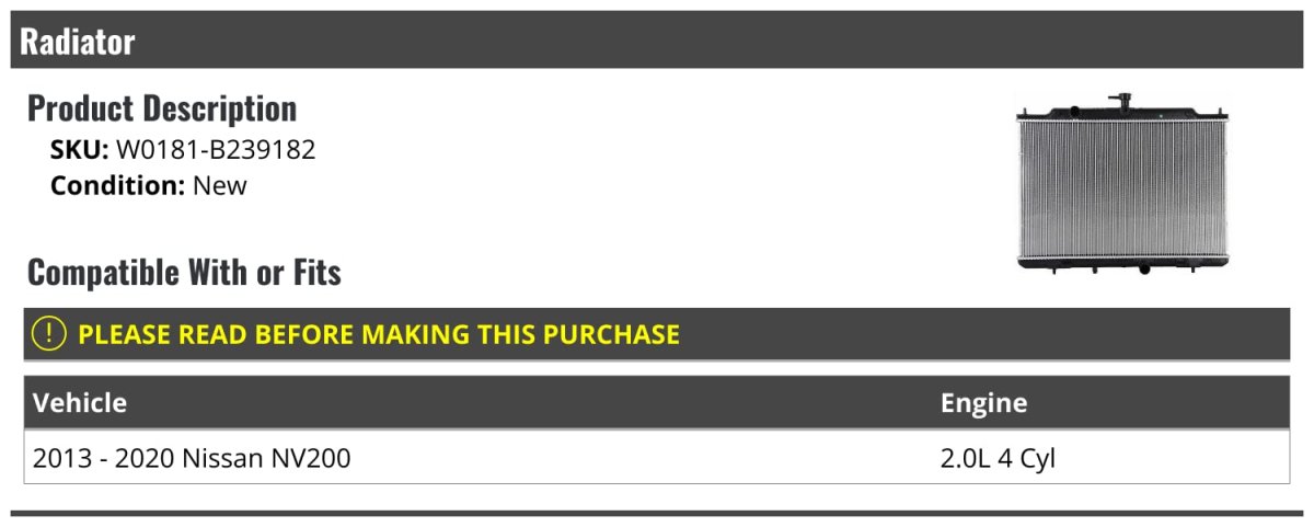 - Radiator For 2013-2020 Nissan Nv200 2 0l 4-cylinder
