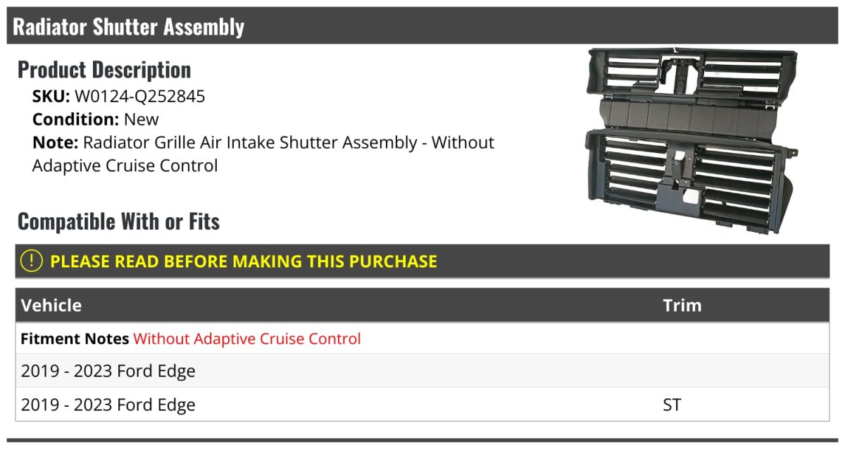 Radiator Grille Air Intake Shutter Assembly - Without Adaptive Cruise Control. Compatible with or fits: 2019 - 2023 Ford Edge - Without Adaptive Cruise Control. Compatible with or fits: 2019 - 2023 Ford Edge ST - Without Adaptive Cruise Control. Review Description to Ensure Proper Fit. Radiator Shutter Assembly.Other fine products