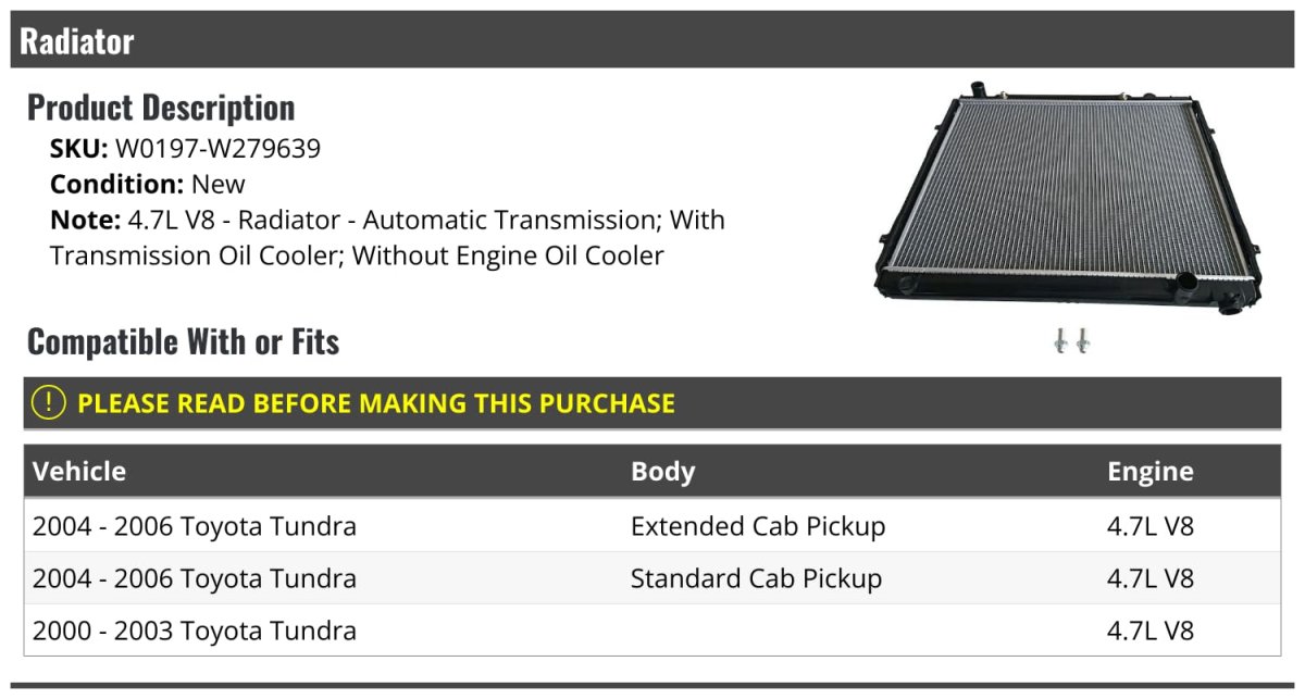 Compatible with or fits: 2004 - 2006 Toyota Tundra Extended Cab Pickup 4.7L V8 Automatic Transmission. Compatible with or fits: 2004 - 2006 Toyota Tundra Standard Cab Pickup 4.7L V8 Automatic Transmission. Compatible with or fits: 2000 - 2003 Toyota Tundra 4.7L V8 Automatic Transmission. For 4.7L V8 Models with Automatic Transmission Only - with Transmission Oil Cooler - without Engine Oil Cooler. Review Description to Ensure Proper Fit.Other fine products