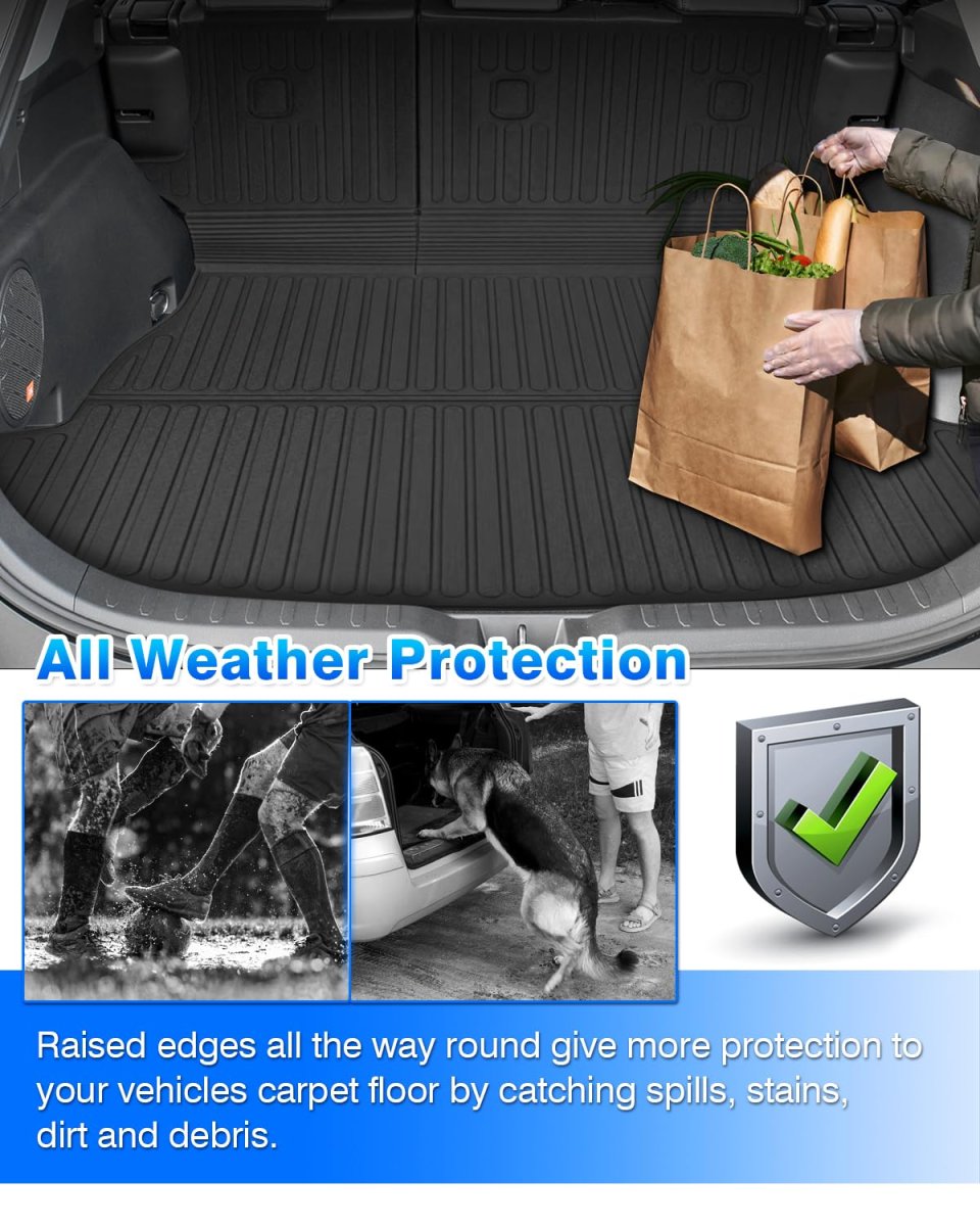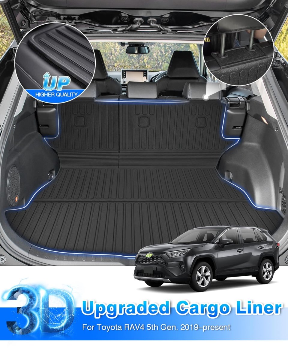 RAV4 Accessories -- This cargo liner with backrest mat is custom-made for RAV4 2019 2020 2021 2022 2023 2024 2025, based on correct vehicle information, no need trimming. Adopts 3D screening technology to capture every corner and crevice to offer perfect fit and coverage.. Premium Material -- The RAV4 cargo liner is made of new materials TPE, which is eco-friendly, non-toxic and odorless. It can be used even at temperature 122F, more temperature resistant than PVC, 100% safe for your family.. Scratch Resistance-- High-density TPE materials ensure high elasticity to make the RAV4 cargo liner wear-resistant, scratch-resistant and durable. It will not deform, harden or break under extreme weather, but remains flexibility and resilience.. Built for Protection-- The groove design of the RAV4 cargo liner, forming channels to collects water, mud, snow, debris, ect, with the raised edge to avoid leakage, providing all weather protection. The anti-slip texture also helps prevent cargo from moving when driving, protect your car's trunk.. Easy to Clean -- The RAV4 cargo liner is waterproof, when it's dirty, you just need 3 seconds to rinse it with water, and wipe with a towel, then it will become dried and new soon..Other fine products