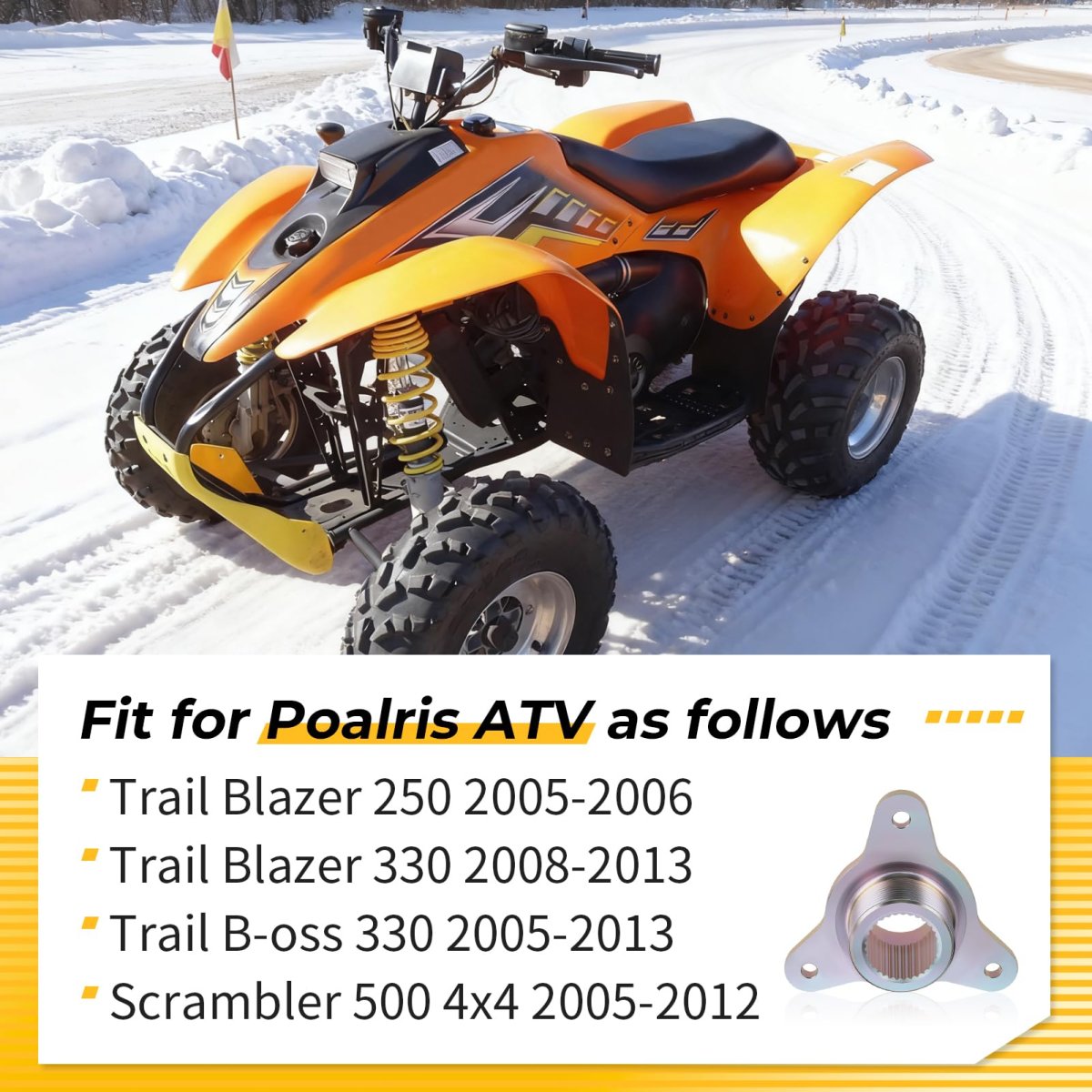 Manufacturer Part# 5631457. Fitment: Fit for Poalris Trail Blazer 250 2005-2006 Trail Blazer 330 2008-2013 Trail B-oss 330 2005-2013 Scrambler 500 4x4 2005-2012. FeatureMade of high strength material , this sprocket hub collar is easy to install on wheel and work for the wheel hub. Package: Rear Brake Disc Rotor Hub x1 in a fine box.Other fine products