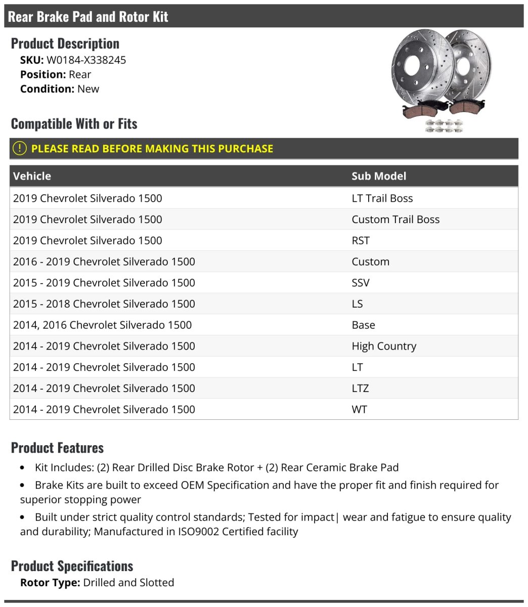 Compatible with or fits: 2019 Chevy Silverado 1500 LT Trail Boss 2019 Chevy Silverado 1500 Custom Trail Boss 2019 Chevy Silverado 1500 RST 2016 - 2019 Chevy Silverado 1500 Custom 2015 - 2019 Chevy Silverado 1500 SSV 2015 - 2018 Chevy Silverado 1500 LS 2014, 2016 Chevy Silverado 1500 Base 2014 - 2019 Chevy Silverado 1500 High Country 2014 - 2019 Chevy Silverado 1500 LT 2014 - 2019 Chevy Silverado 1500 LTZ. Compatible with or fits: 2014 - 2019 Chevy Silverado 1500 WT. Kit Includes: (2) Rear Drilled Disc Brake Rotor + (2) Rear Ceramic Brake Pad. Brake Kits are built to exceed OEM Specification and have the proper fit and finish required for superior stopping power. Includes: (2) Rear Drilled Slotted Disc Brake Rotors + (1) Rear Ceramic Brake Pad Set.Other fine products