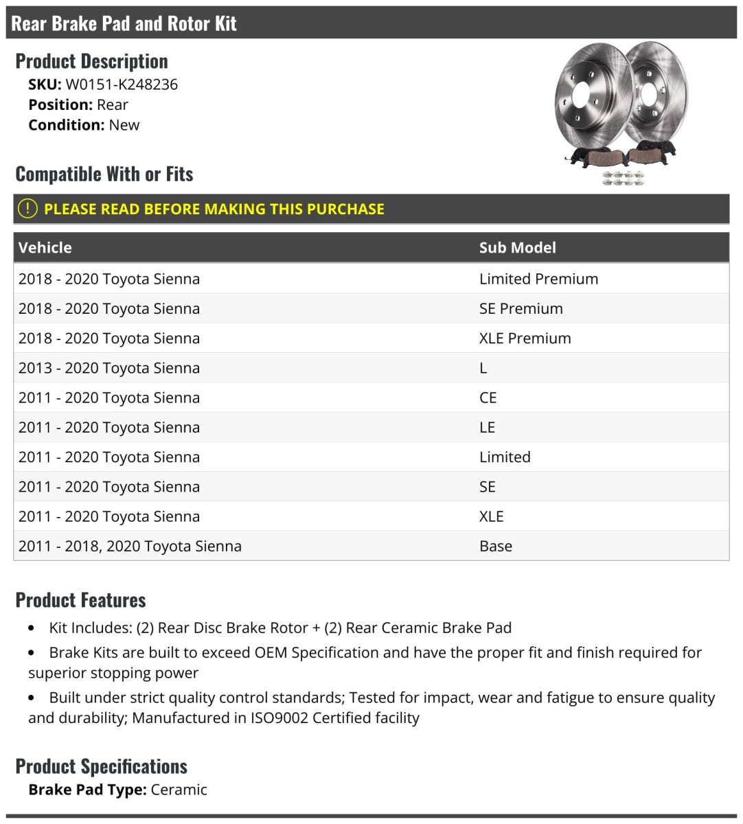 Compatible with or fits: 2018 - 2020 Toyota Sienna Limited Premium 2018 - 2020 Toyota Sienna SE Premium 2018 - 2020 Toyota Sienna XLE Premium. Compatible with or fits: 2013 - 2020 Toyota Sienna L 2011 - 2020 Toyota Sienna CE 2011 - 2020 Toyota Sienna LE. Compatible with or fits: 2011 - 2020 Toyota Sienna Limited 2011 - 2020 Toyota Sienna SE. Compatible with or fits: 2011 - 2020 Toyota Sienna XLE 2011 - 2018, 2020 Toyota Sienna Base. Kit Includes: (2) Rear Disc Brake Rotors + (1) Rear Ceramic Brake Pad Set.Other fine products