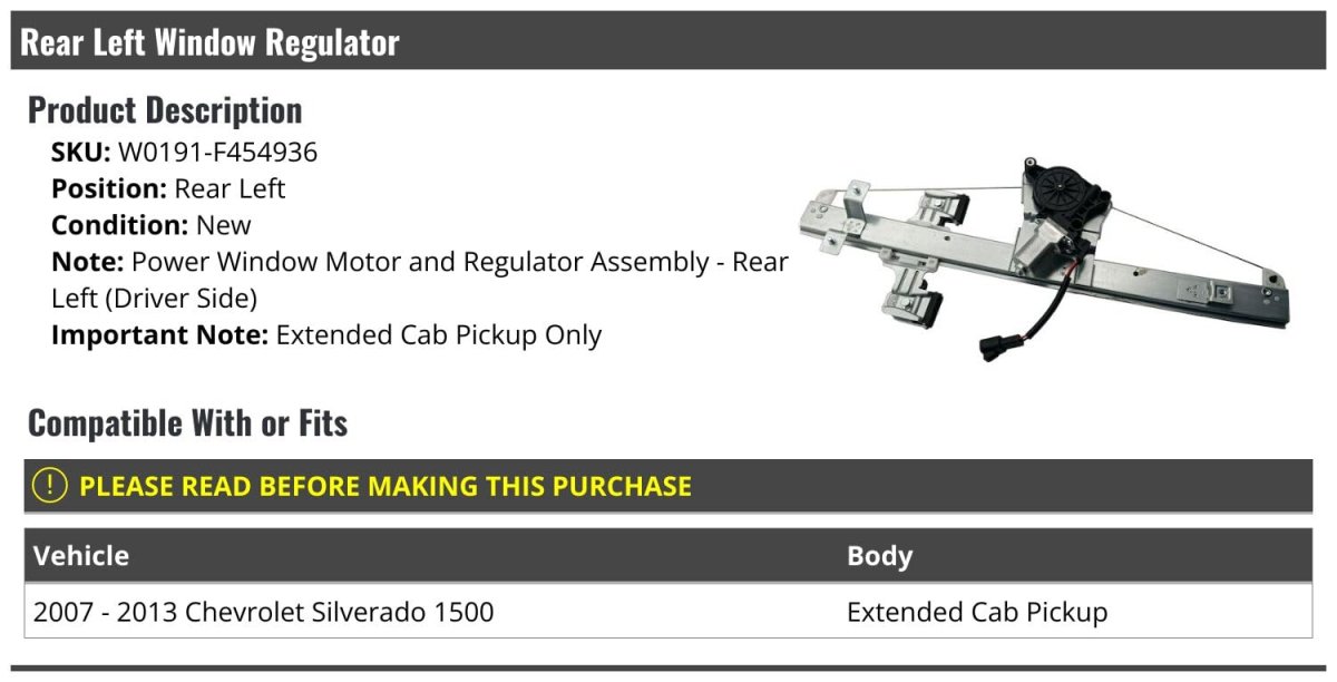 - Rear Left Driver Side Power Window Motor And Regulator Assembly For 2007-2013 Chevy Silverado 1500 Extended Cab Pickup