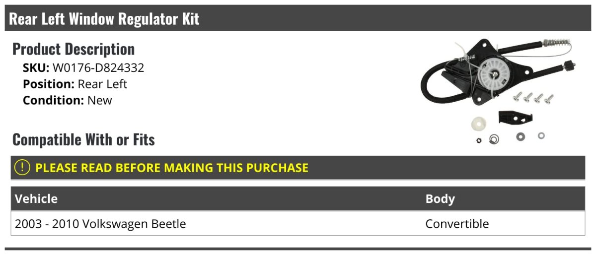 - Rear Left Driver Side Window Regulator Kit For 2003-2010 Volkswagen Beetle Convertible
