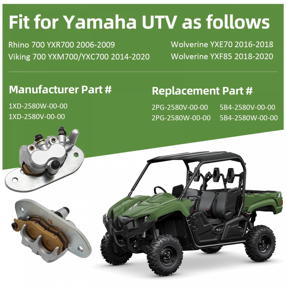 Manufacturer Part # 1XD-2580W-00-00 1XD-2580V-00-00 Replacement Part# 2PG-2580V-00-00 2PG-2580W-00-00 5B4-2580V-00-00 5B4-2580W-00-00. Fitment:Fit for Yamaha Rhino 700 YXR700 2006-2009 Viking 700 YXM700/YXC700 2014-2020 Wolverine YXE70 2016-2018 Wolverine YXF85 2018-2020. Feature: This is cost-effective repalcement brake calipers for Yamaha UTV. The brake calipers with brake pads, banjos, mounting bracket, direct install.. Material: Alloy piston and anti-ageing seal kit make the caliper have more braking force and longer operation life..
