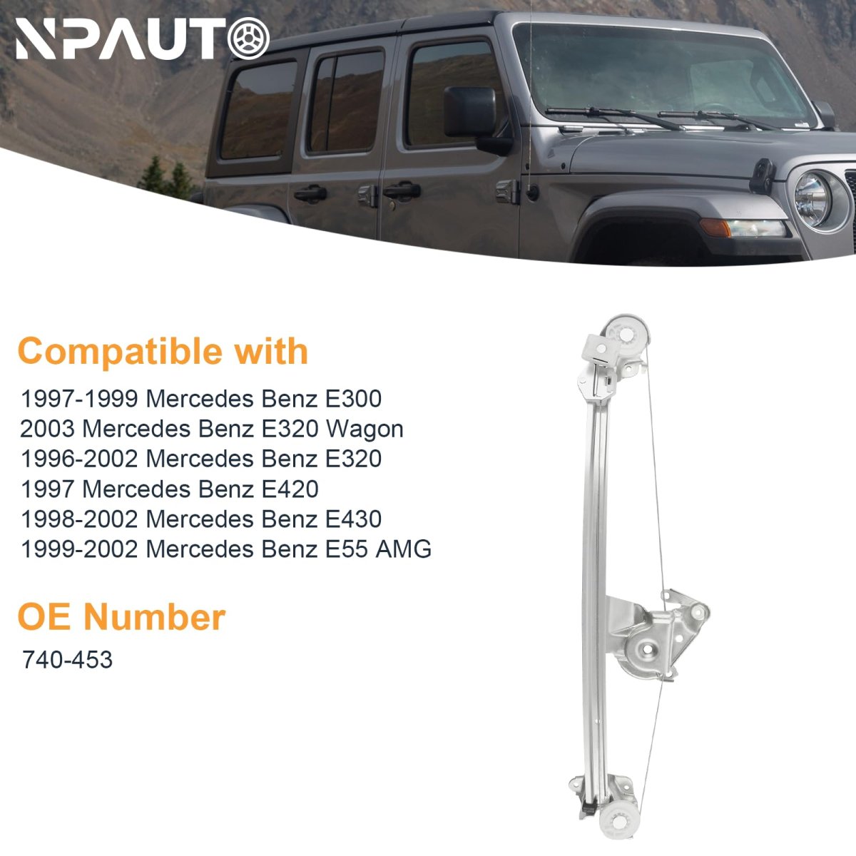 Rear power window regulator without motor assembly for Mercedes Benz E-Class 1996 1997 1998 1999 2000 2001 2002 Mercedes Benz E300 E320 E420 E430 E55 AMG. OE Number: 740-452 740452 2107301446 2107301546 2107301346; 740-453 740453 2017300346 2107301646 2107301446. Location: Rear right passenger side (come without motor). Easy Installation: this product is a direct replacement for your vehicle. Built to OE standards, it will slid smooth and quick without noise..Other fine products