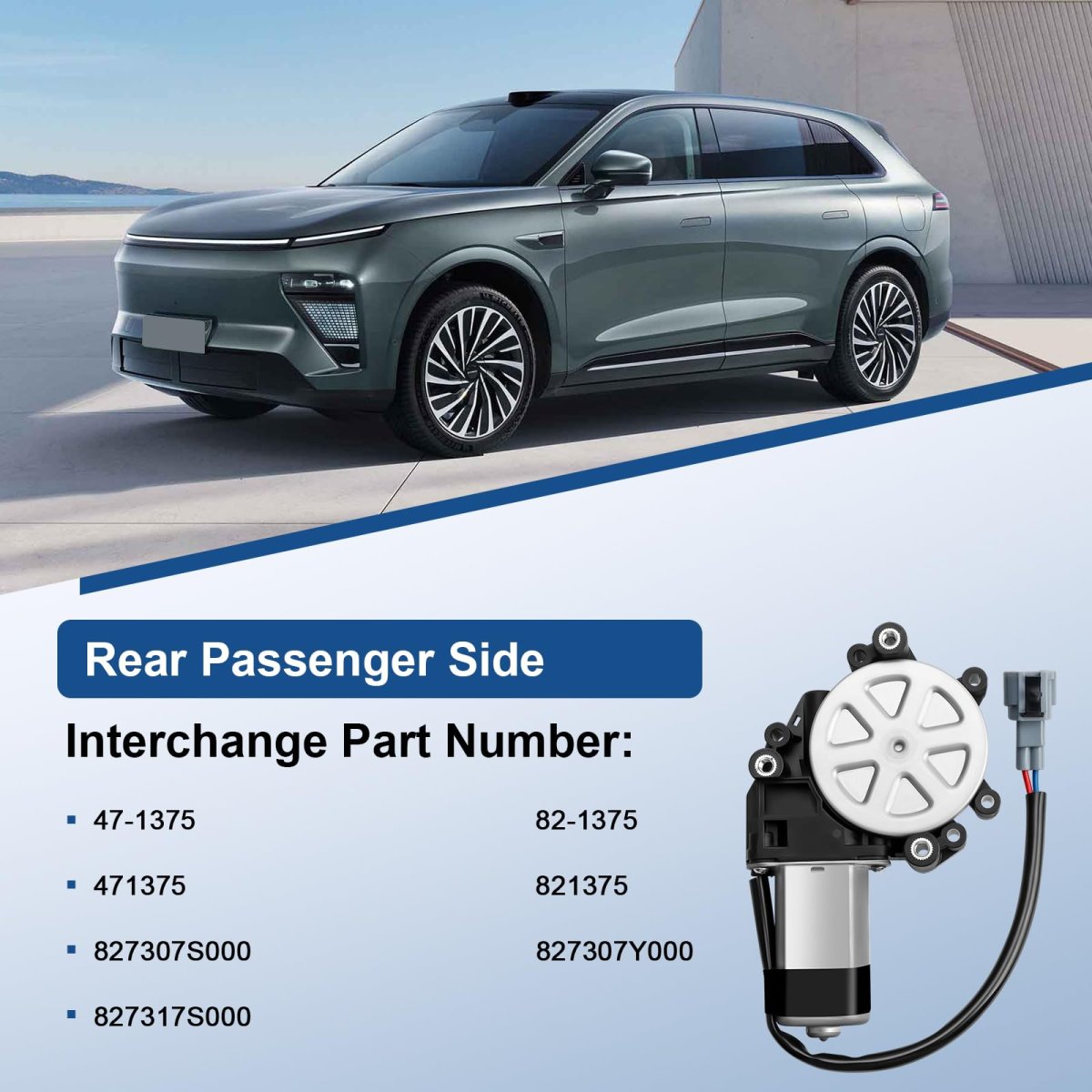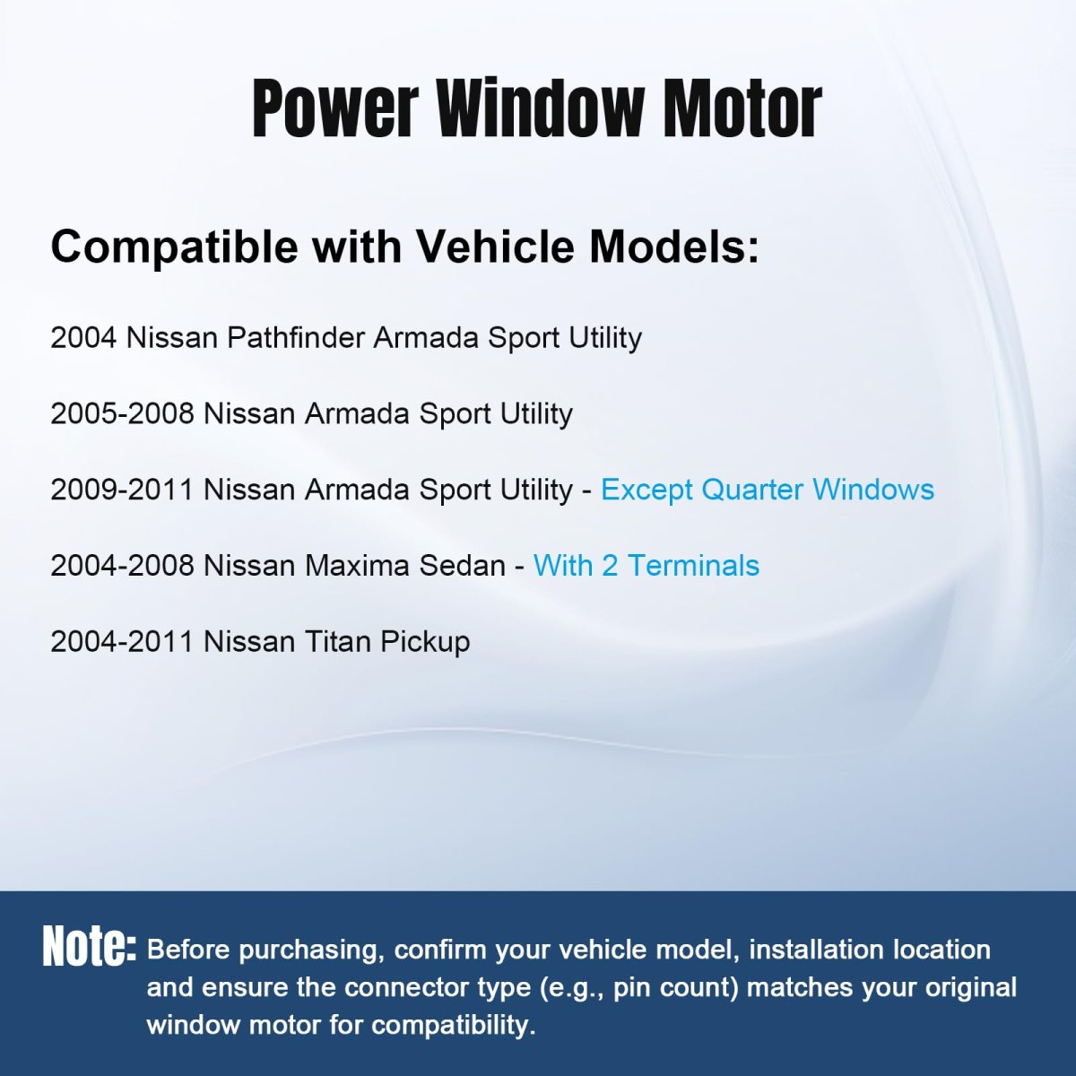 [Vehicle Fits] - Rear Right Passenger Side Power Window Lift Motor compatible with 2004-2011 Nissan Titan Pickup, 2005-2008 Nissan Armada Sport Utility, 2009-2011 Nissan Armada Sport Utility- Except Quarter Windows, 2004-2008 Nissan Maxima Sedan- With 2 Terminals, 2004 Nissan Pathfinder Armada Sport Utility. [Interchange Part Number] - 47-1374 82-1374 827317S000 827317Y000 471374 821374 / 471375 821375 827307S000 827307Y000 827317S000. [Excellent Durability & Quality] - The window motor is crafted from premium materials and rigorously tested for durability. It can prevent premature wear, striping and breakage. With a long and reliable lifespan, this product meets or exceeds OEM specifications for a perfect fit. [Strong Power & Silent Operation] - Featuring a high-performance copper wire winding motor, it delivers stable powerful torque for effortless window operation even with heavy glass. The optimized gear design significantly reduces noise, ensuring a quiet and comfortable driving experience.Other fine products
