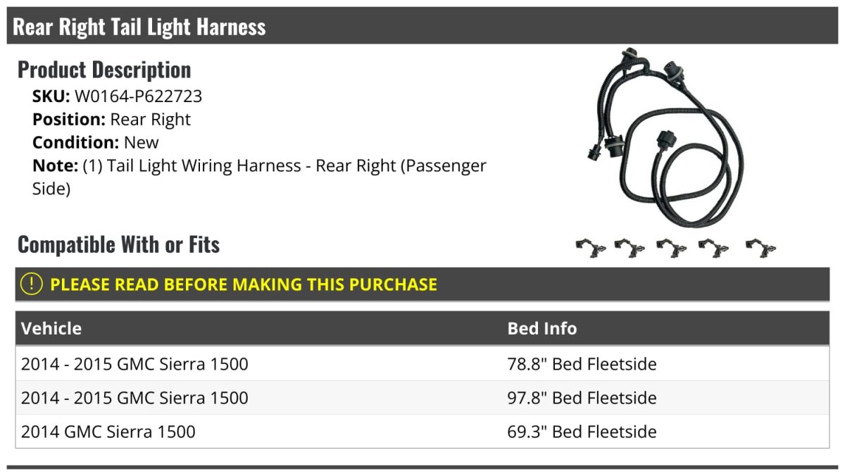 Compatible with or fits: 2014 - 2015 GMC Sierra 1500 with 78.8 Inch Bed Fleetside. Compatible with or fits: 2014 - 2015 GMC Sierra 1500 with 97.8 Inch Bed Fleetside. Compatible with or fits: 2014 GMC Sierra 1500 with 69.3 Inch Bed Fleetside. (1) Tail Light Wiring Harness - (Rear Right Passenger Side). Review Description to Ensure Proper Fit.Other fine products