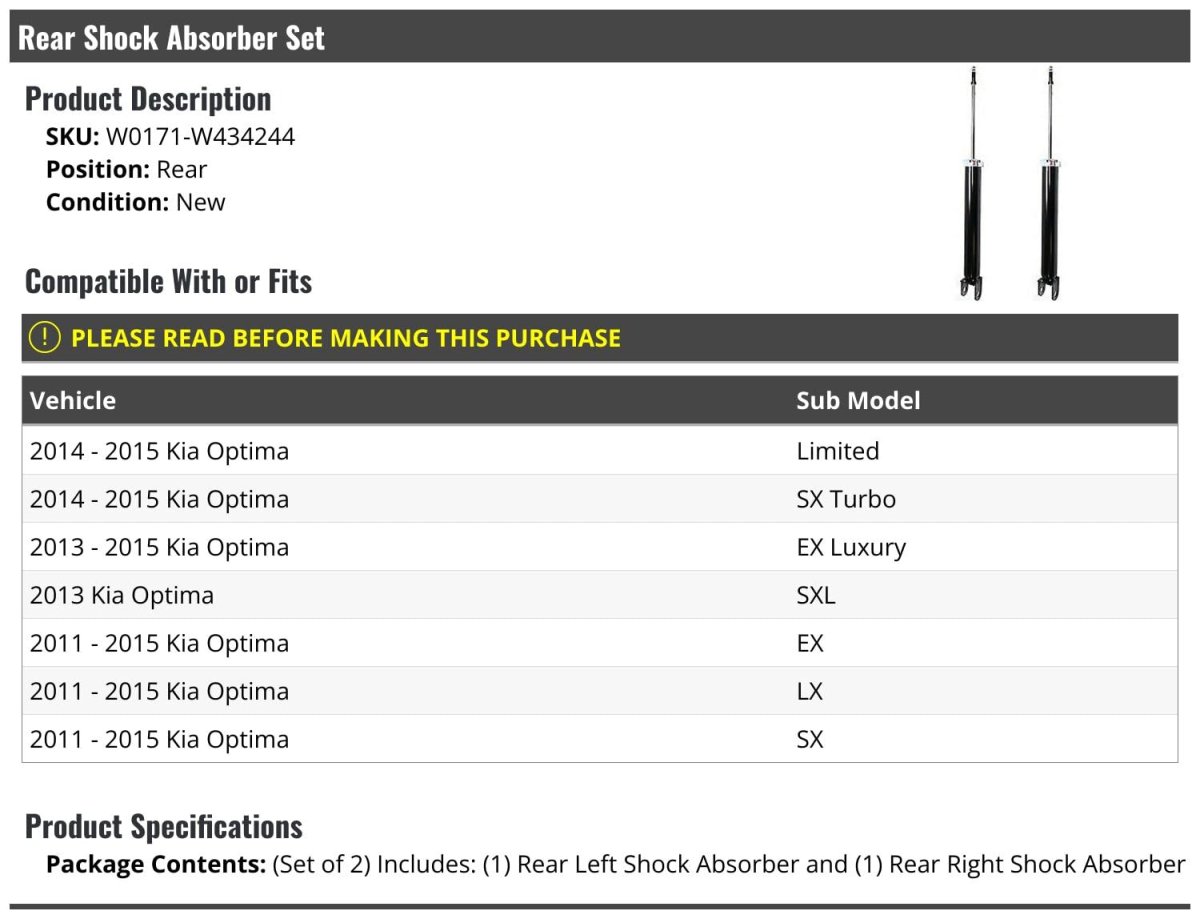 - Rear Shock Absorber Set Of 2 For 2011-2015 Kia Optima
