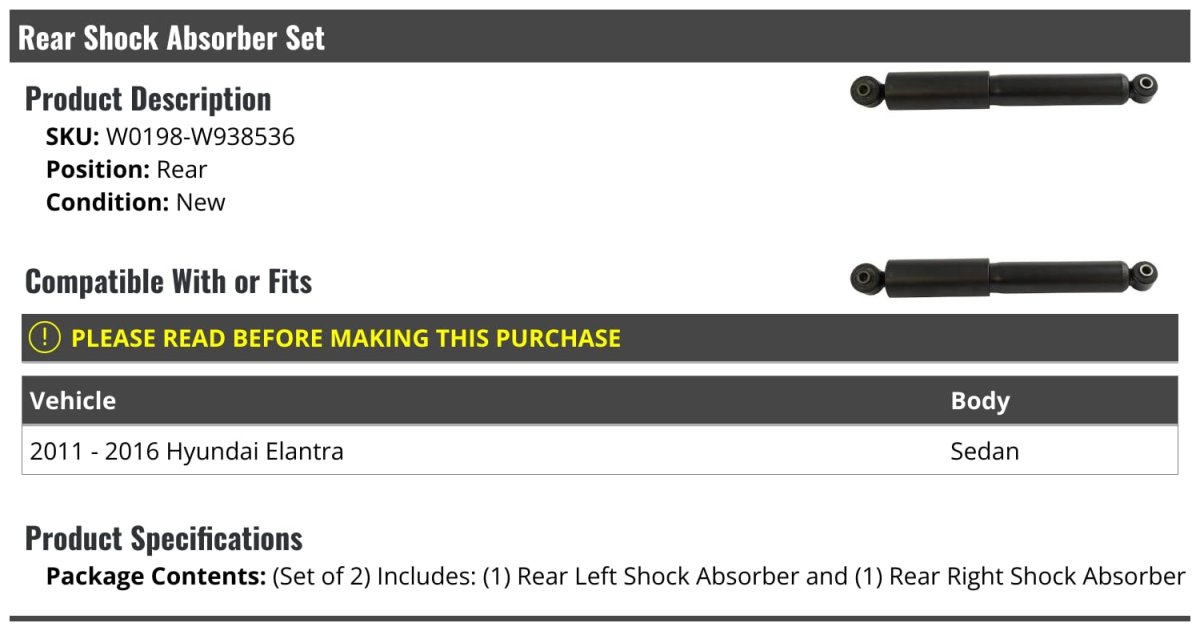 - Rear Shock Absorber Set Of 2 For 2011-2016 Hyundai Elantra Sedan